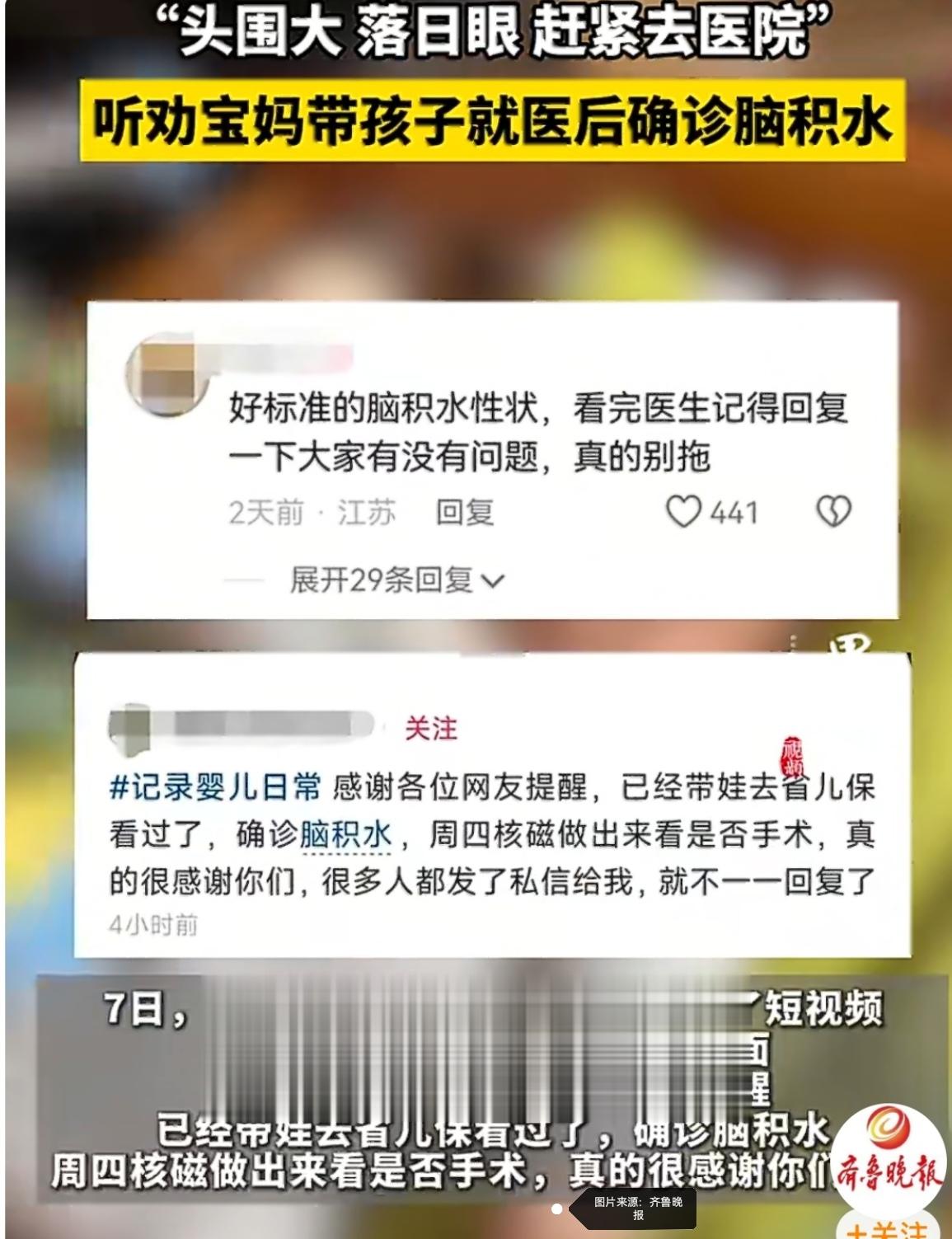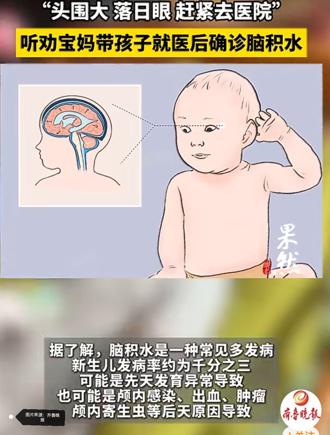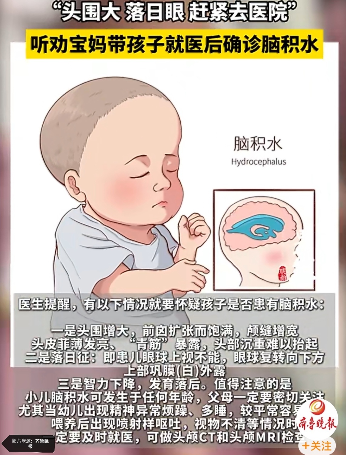 这件事也给所有家长敲了一记警钟。小儿脑积水早期症状并不明显,但“落日眼”、头围异常增大、囟门饱满、频繁呕吐、发育落后等,都是非常典型的信号。很多家长不懂,容易当成小毛病忽略,一旦耽误治疗,后果不堪设想。