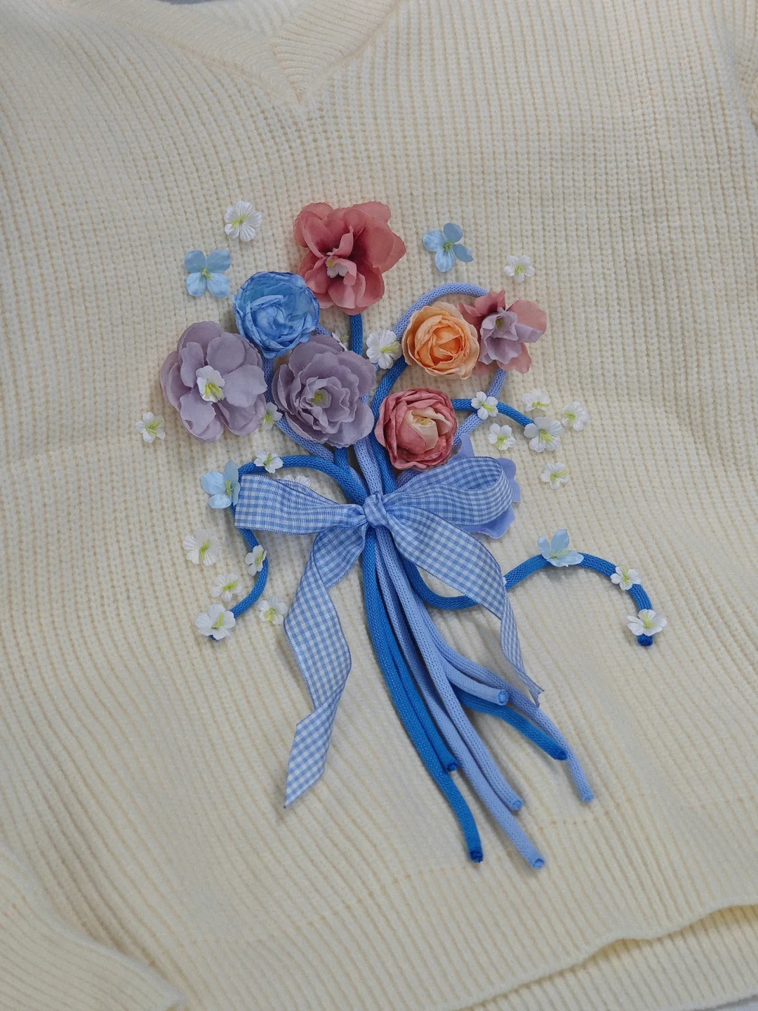 💙灰色這款毛衣是前兩年打的樣「因為一些細節問題所以一直沒有生產,而我本身也很拖延🥺」,前兩天整理庫存時候給翻了出來,,,一扭頭看到助理手工桌上的一些花「每次用完的花都會遺留一兩朵在桌上,越積越多,逐漸分類就很麻煩,索性桌上就放了一個專門收集殘花的容器😂」,於是我加了一些棉繩和一些緞帶在毛衣上做了一束花,,,