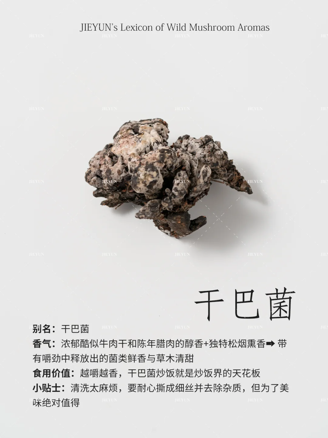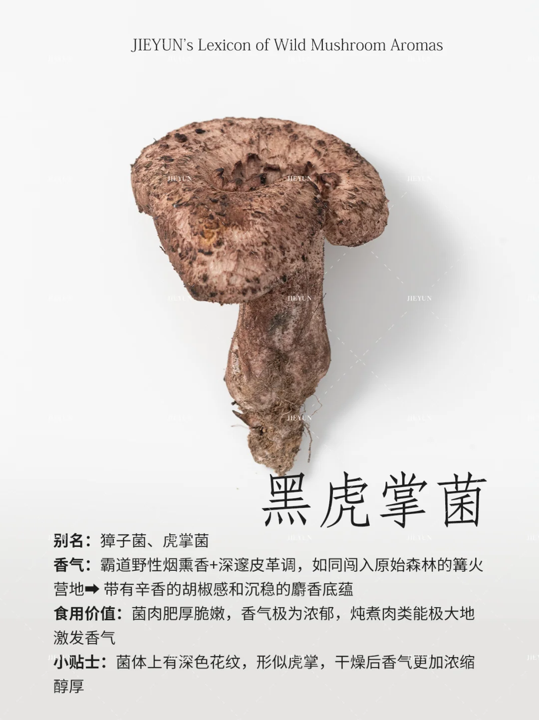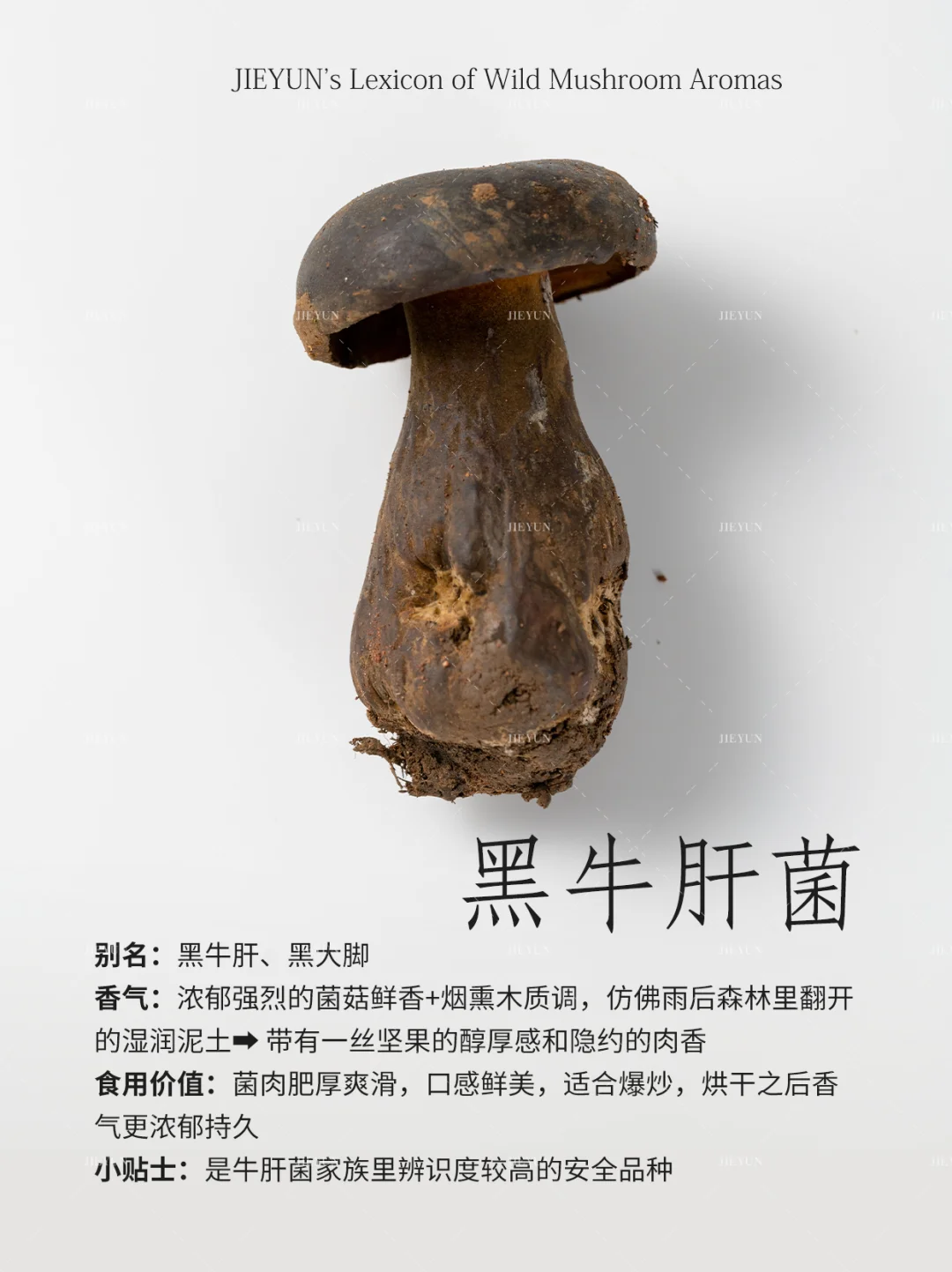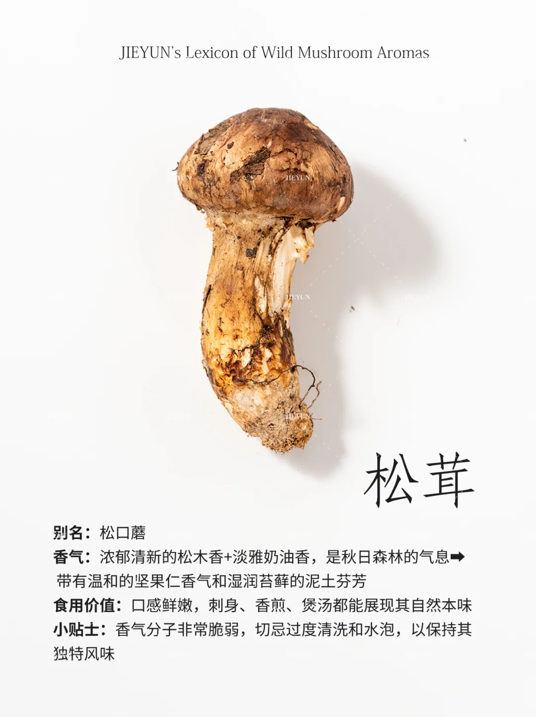 香气描述:微妙甜杏仁香+独特矿石灰尘感,一种危险而迷人的气息⚠️➡️ 烹饪后转化为浓郁的菌鲜和一丝木质调