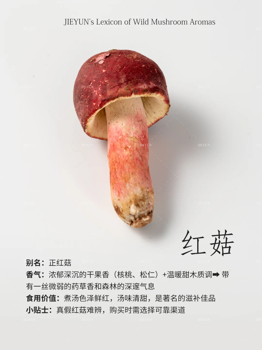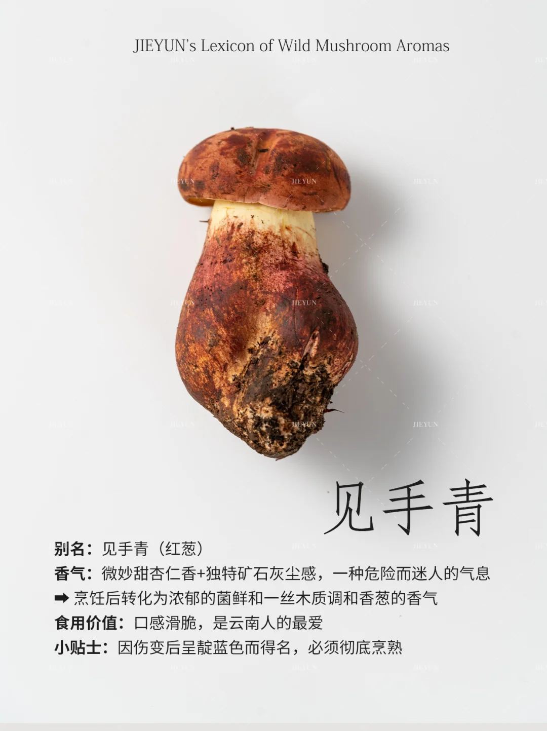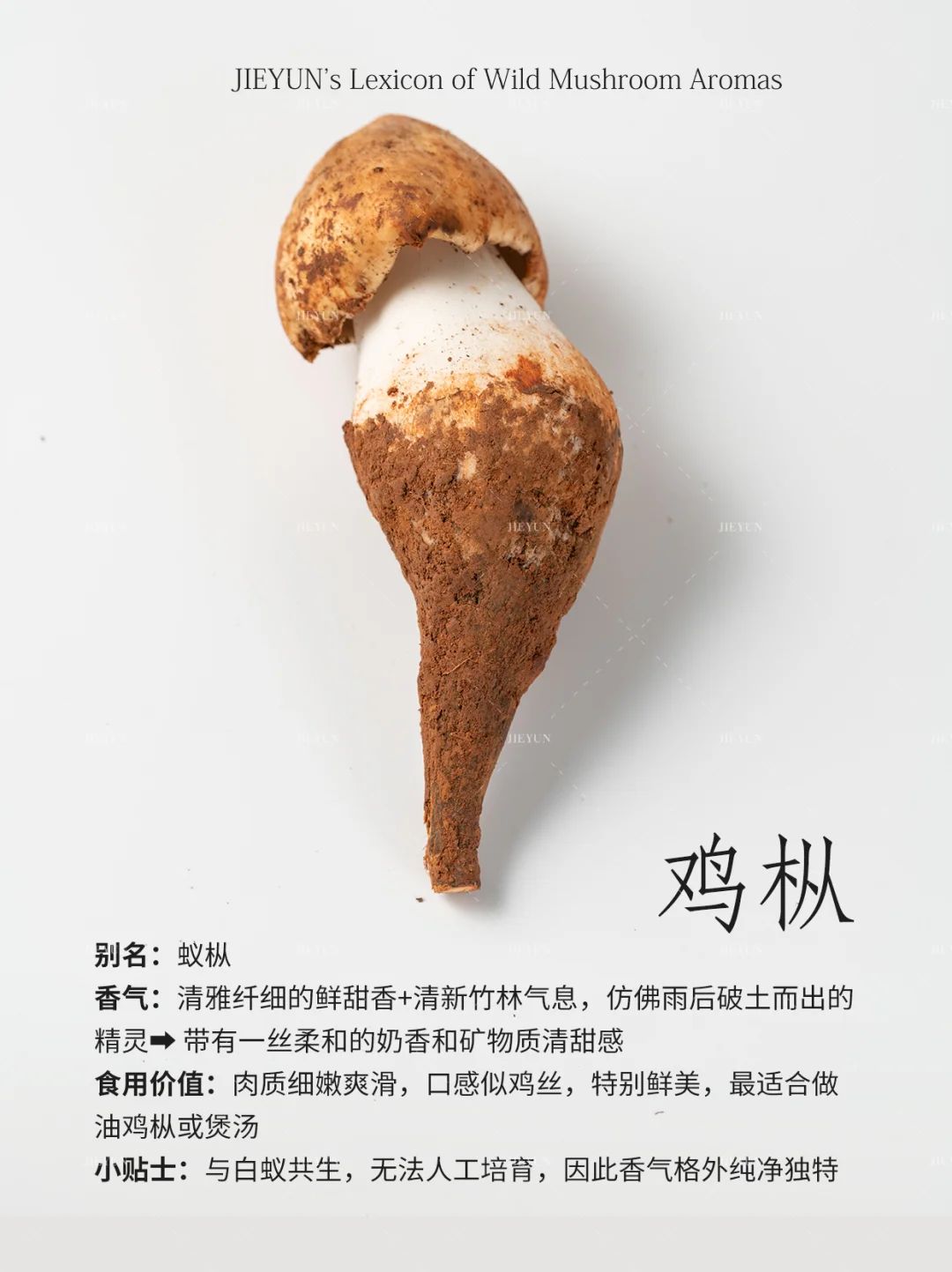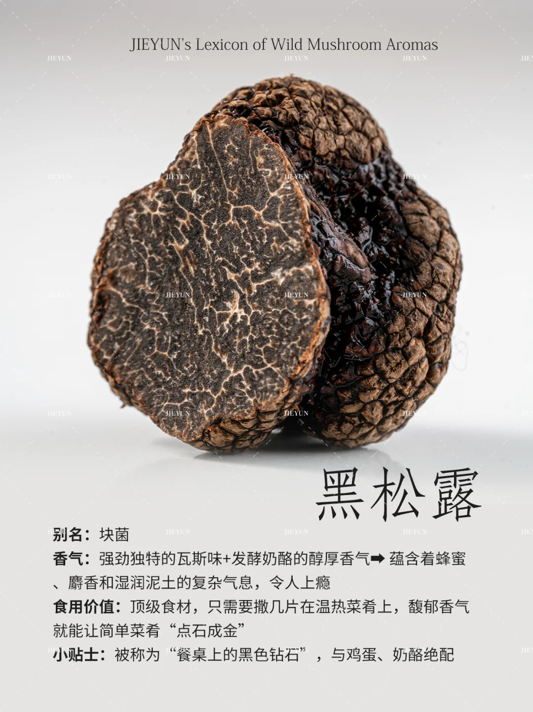 香气描述:微妙甜杏仁香+独特矿石灰尘感,一种危险而迷人的气息⚠️➡️ 烹饪后转化为浓郁的菌鲜和一丝木质调