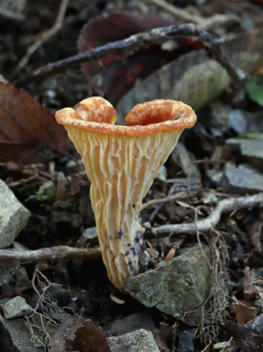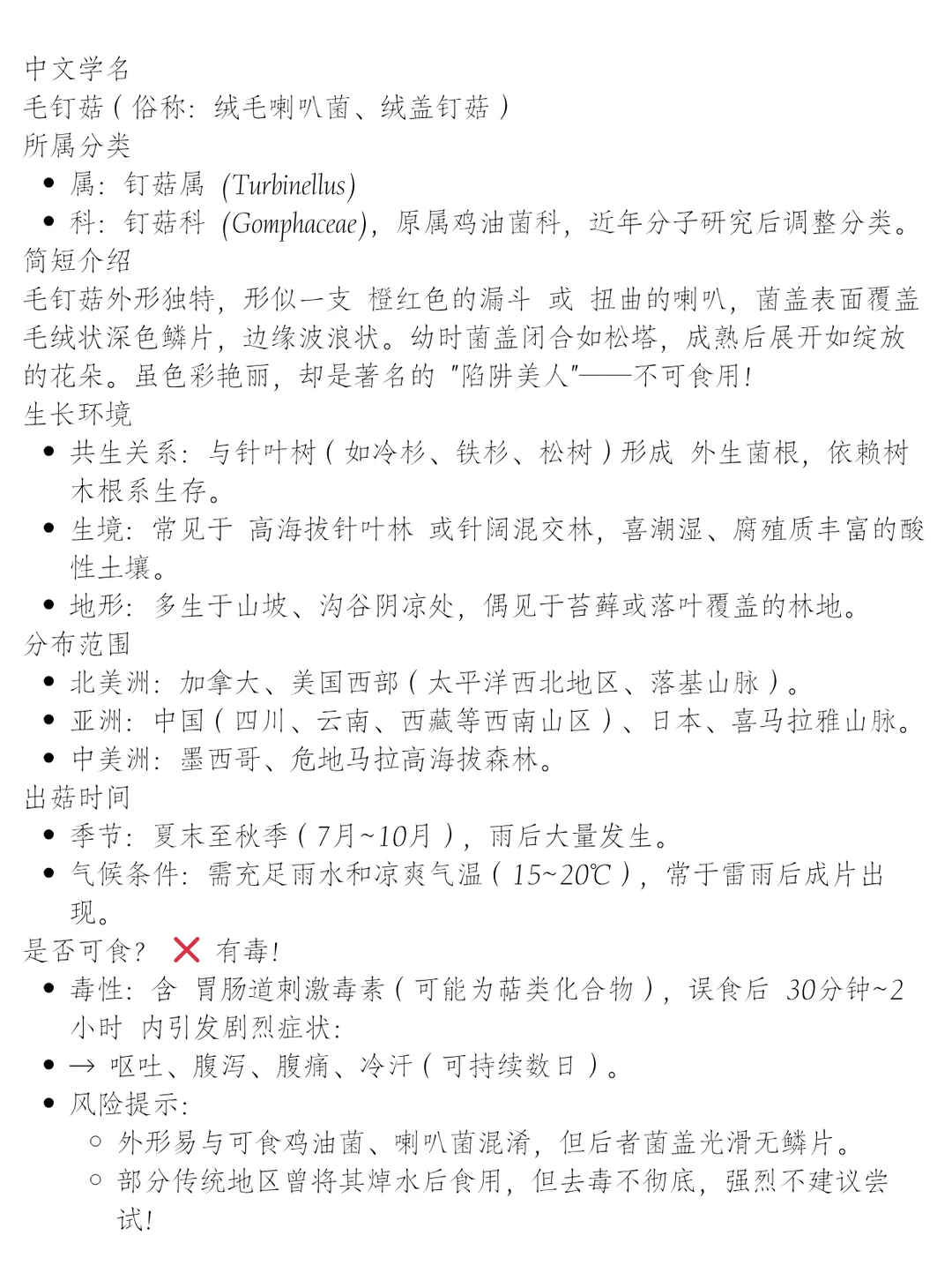 毛钉菇外形独特,形似一支 橙红色的漏斗 或 扭曲的喇叭,菌盖表面覆盖 毛绒状深色鳞片,边缘波浪状。幼时菌盖闭合如松塔,成熟后展开如绽放的花朵。虽色彩艳丽,却是著名的 "陷阱美人"——不可食用!