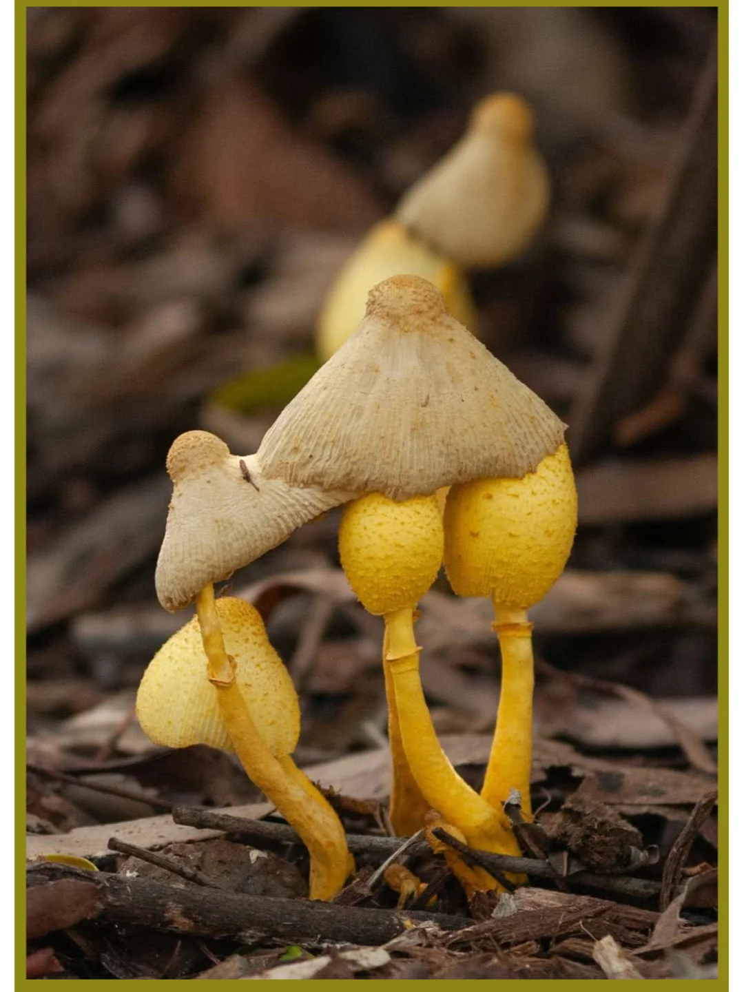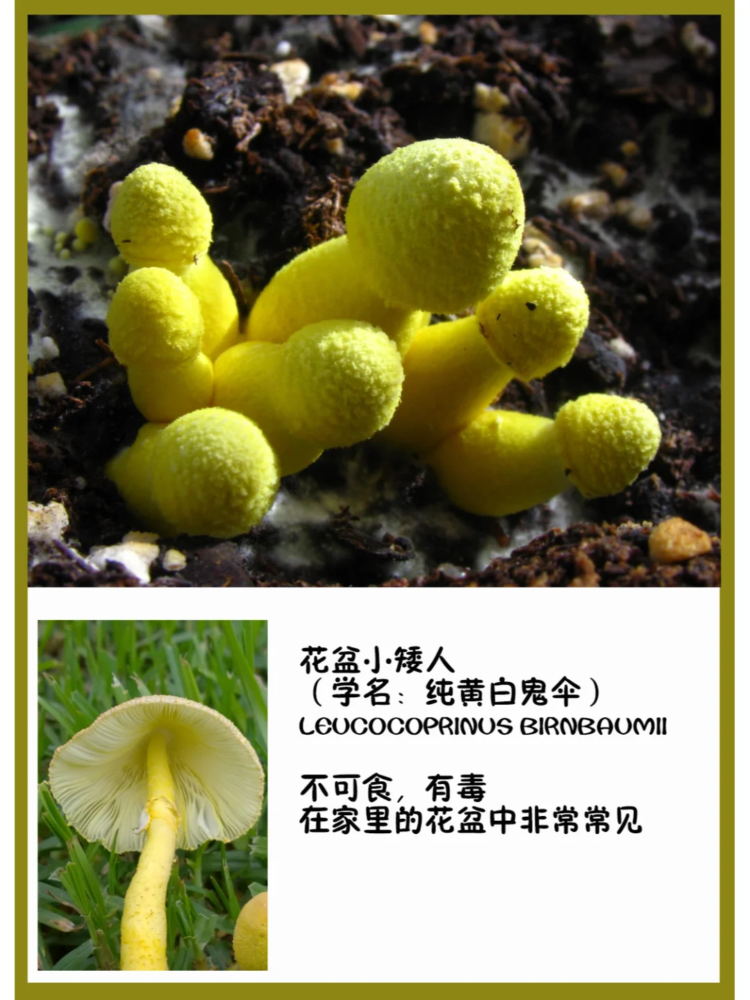 花盆小矮人 (学名:纯黄白鬼伞) Leucocoprinus birnbaumii 不可食,有毒 在家里的花盆中非常常见