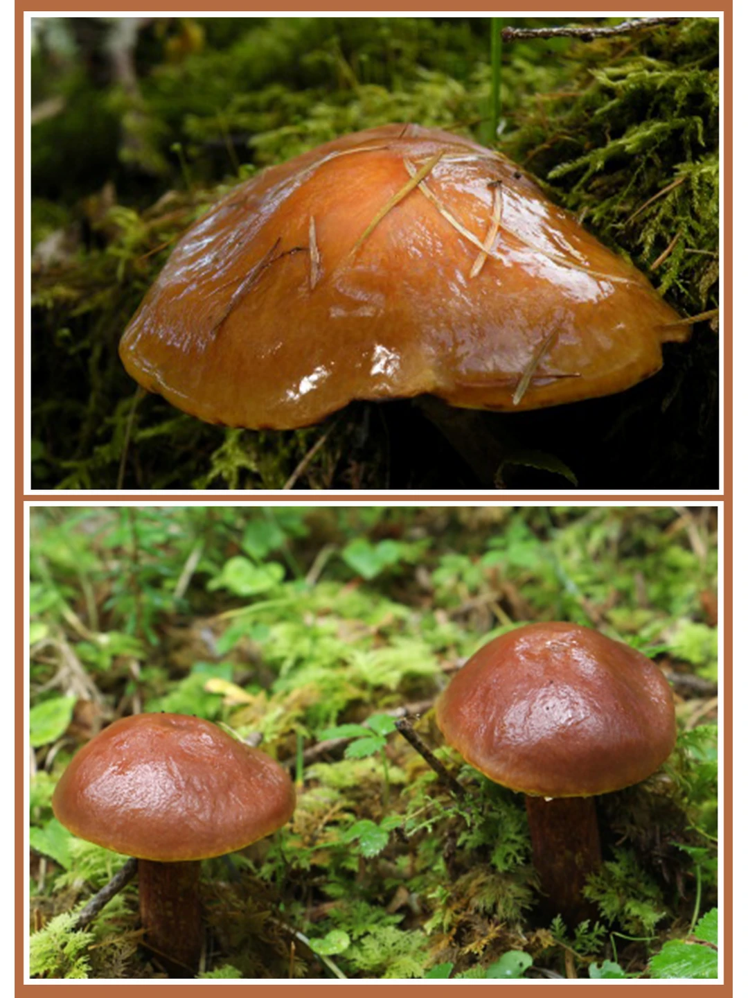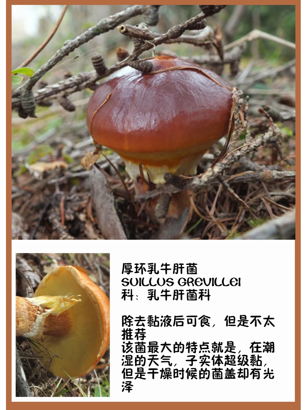 厚环乳牛肝菌 Suillus grevillei 科:乳牛肝菌科 除去黏液后可食,但是不太推荐[doge] 该菌最大的特点就是,在潮湿的天气,子实体超级黏,但是干燥时候的菌盖却有光泽 厚环乳牛肝菌可以制成从褐色到灰橙色的多种染料,而且是中药“腱松散”的一种成分,据说有益于腰腿疼