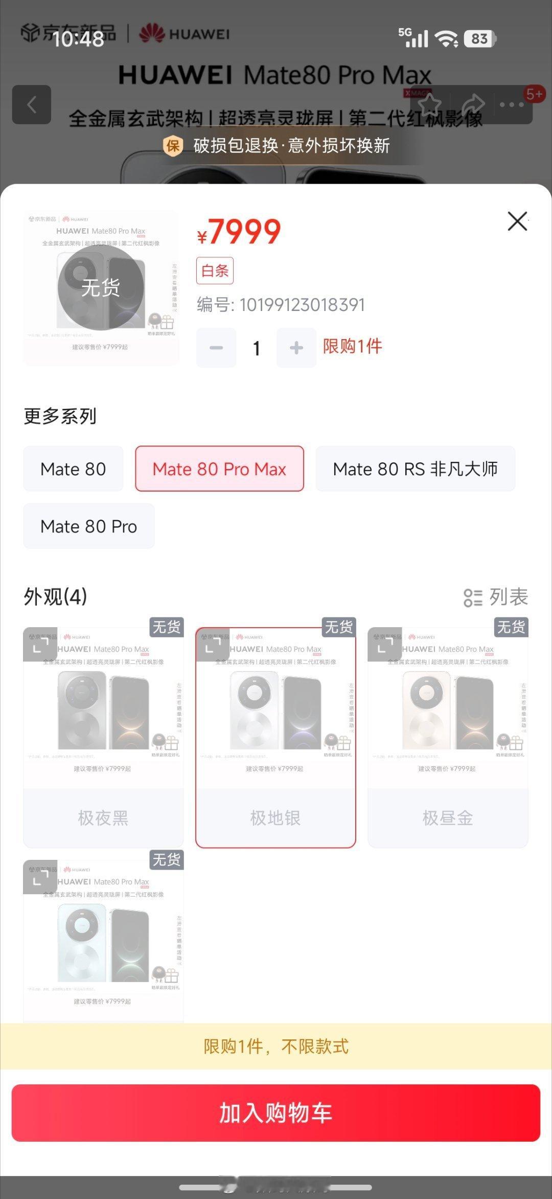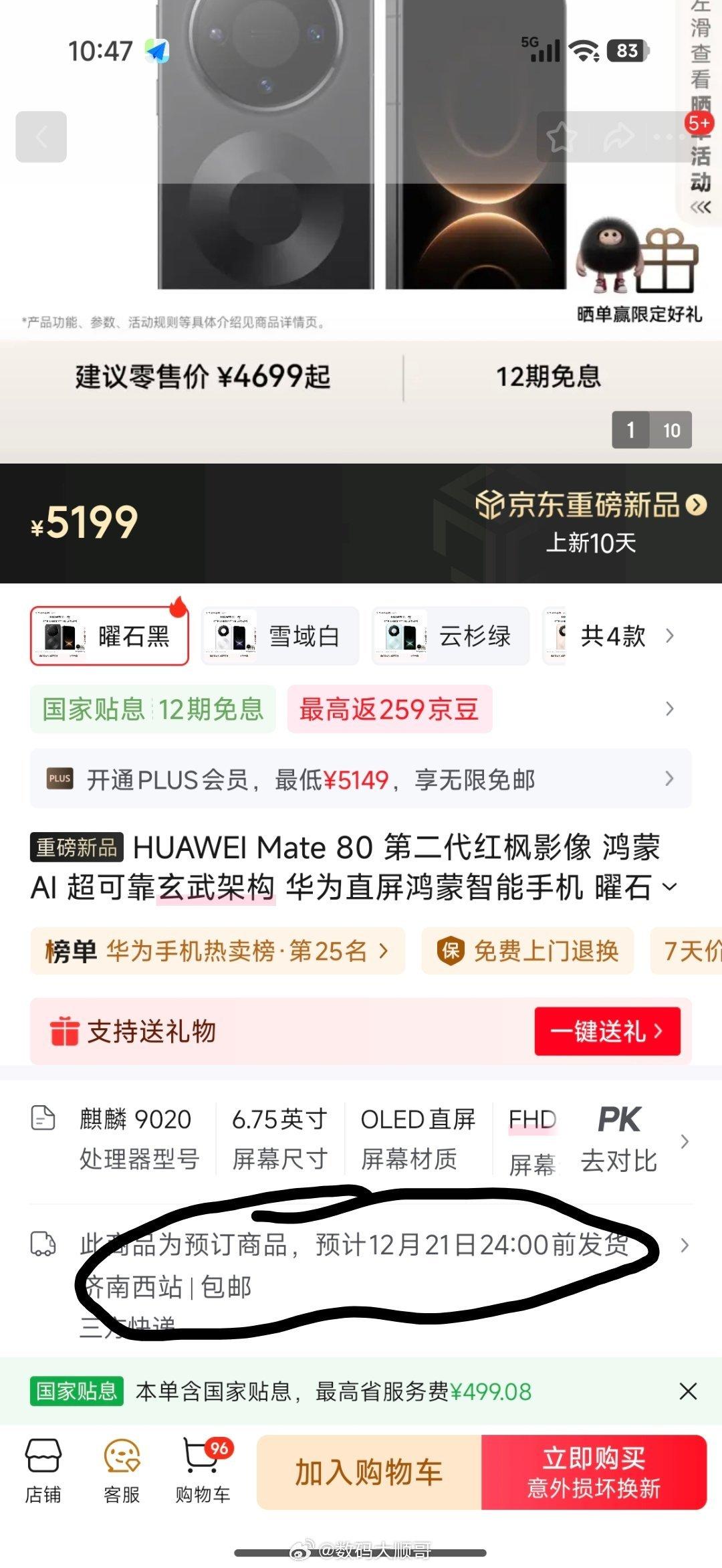 华为Mate 80今天开售了,大家冲了吗?10:08准时开抢,起价4699。我看了下,标准版还能下单,不过要等到12月21号才发货。至于最想要的Pro Max,果然还是秒没,根本抢不到这热度也太夸张了,实力破圈了~华为Mate80系列今日开售