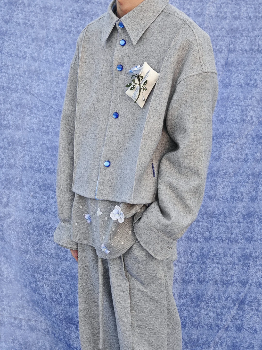 🔷一件折痕羊毛襯衣 💙胸針搭配了一枝纏花玫瑰 💙圖3能同時看到胸前和後背折痕的轉折面 🤍ps: 釦子是我2016年剛做品牌時候就開始使用的,我很喜歡它有貓眼的質感和復古的感覺,很微妙,給我一種小時候我媽衣服上會出現的釦子的感受