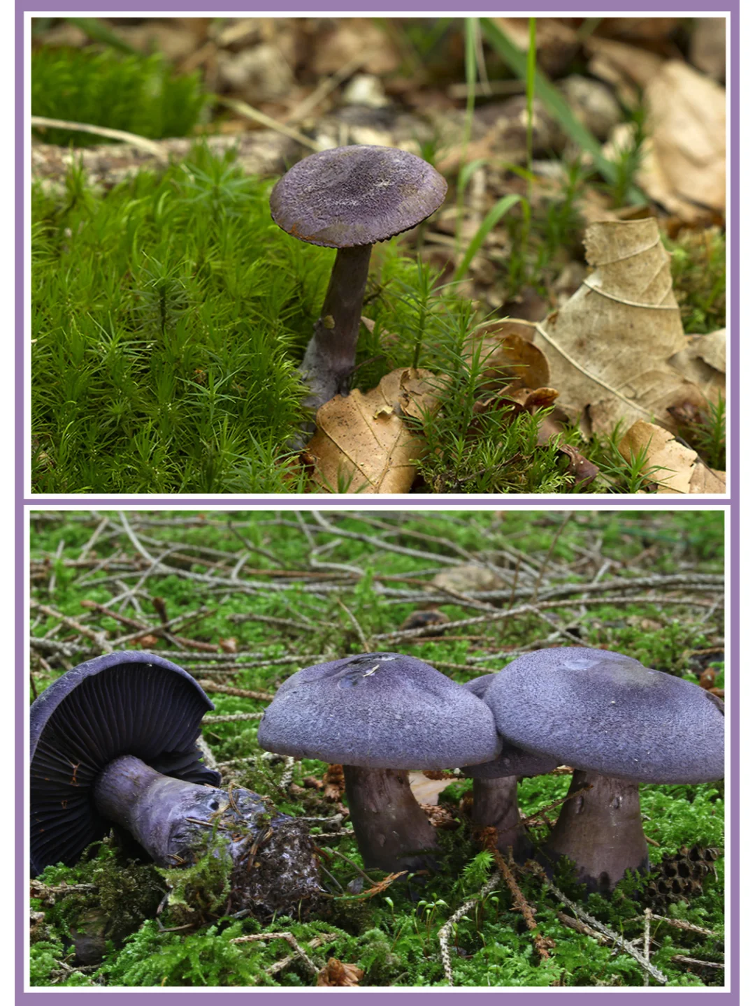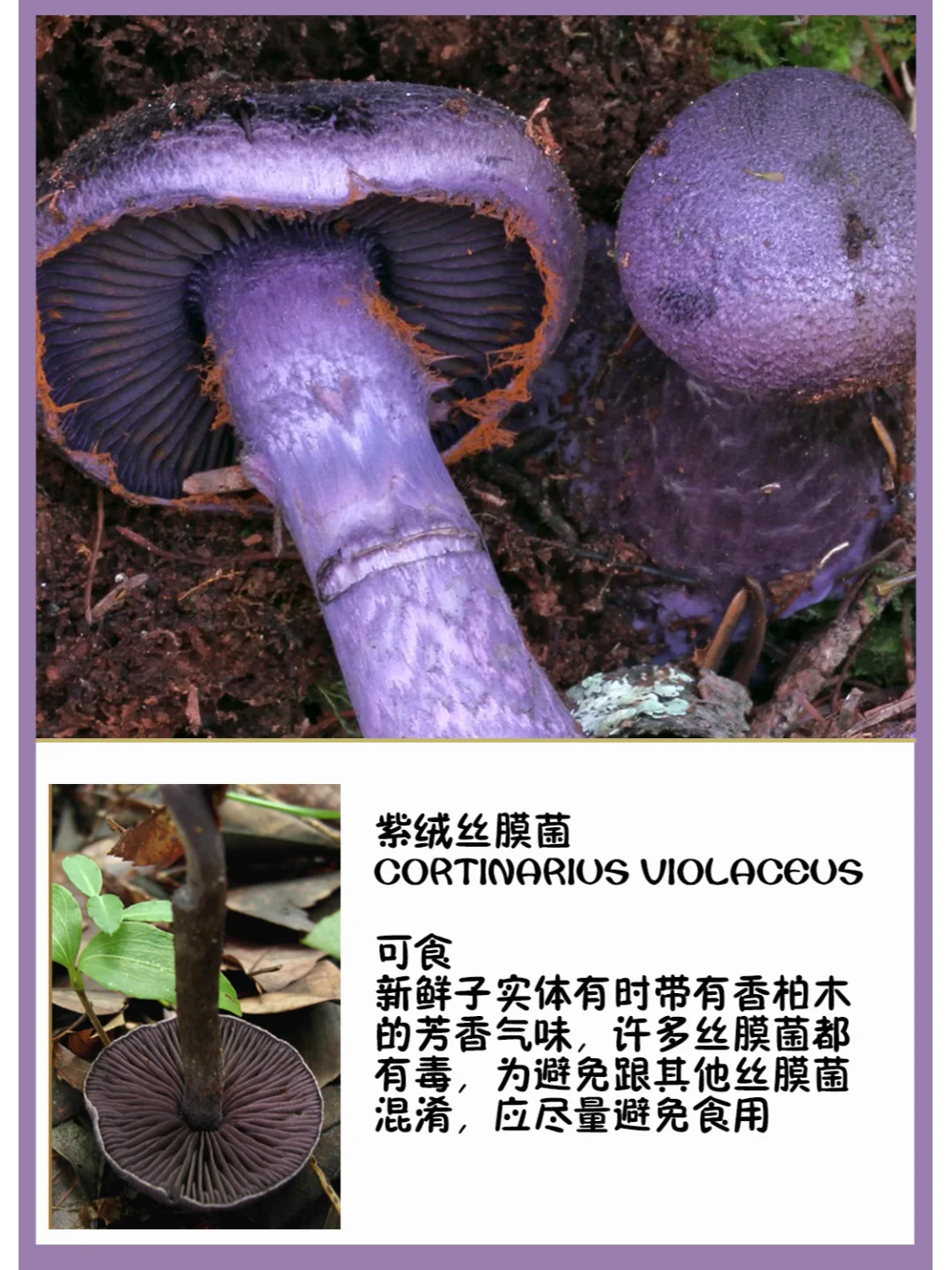 紫绒丝膜菌 Cortinarius violaceus 可食 新鲜子实体有时带有香柏木的芳香气味,许多丝膜菌都有毒,为避免跟其他丝膜菌混淆,应尽量避免食用