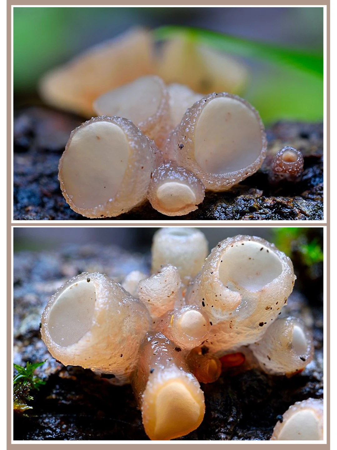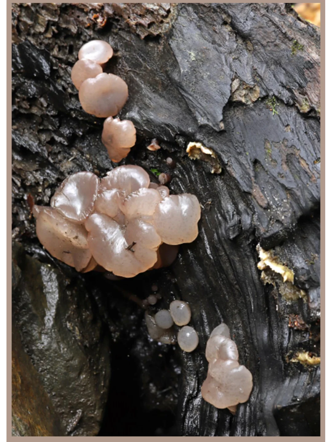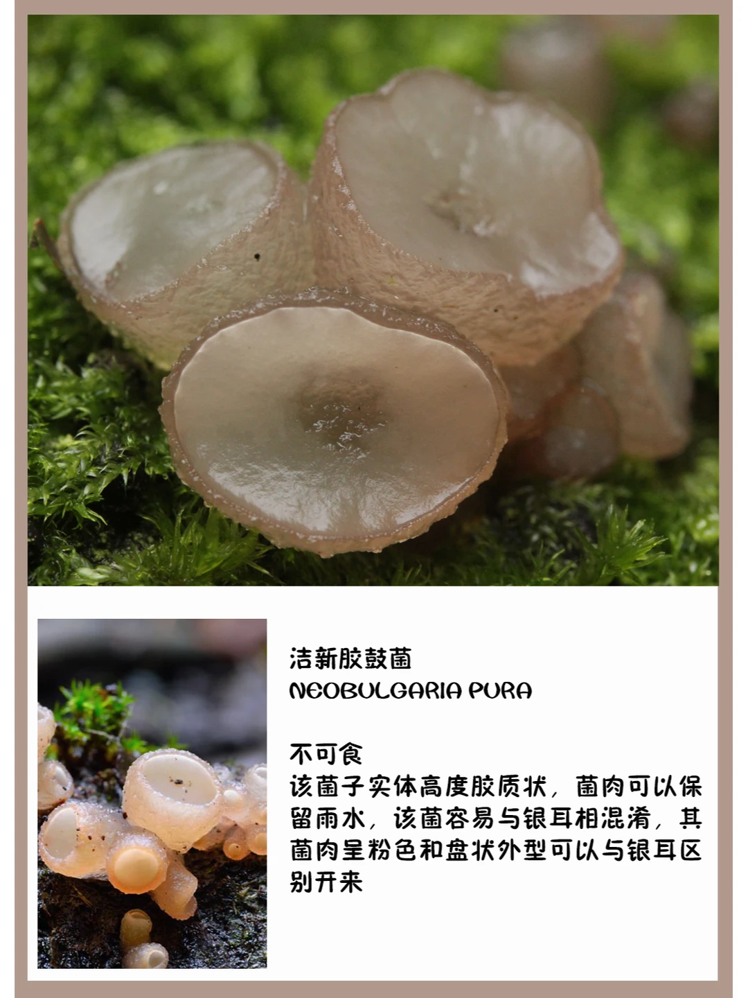 洁新胶鼓菌 Neobulgaria pura 不可食 该菌子实体高度胶质状,菌肉可以保留雨水,该菌容易与银耳相混淆,其菌肉呈粉色和盘状外型可以与银耳区别开来
