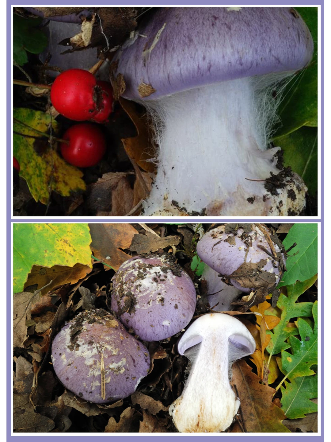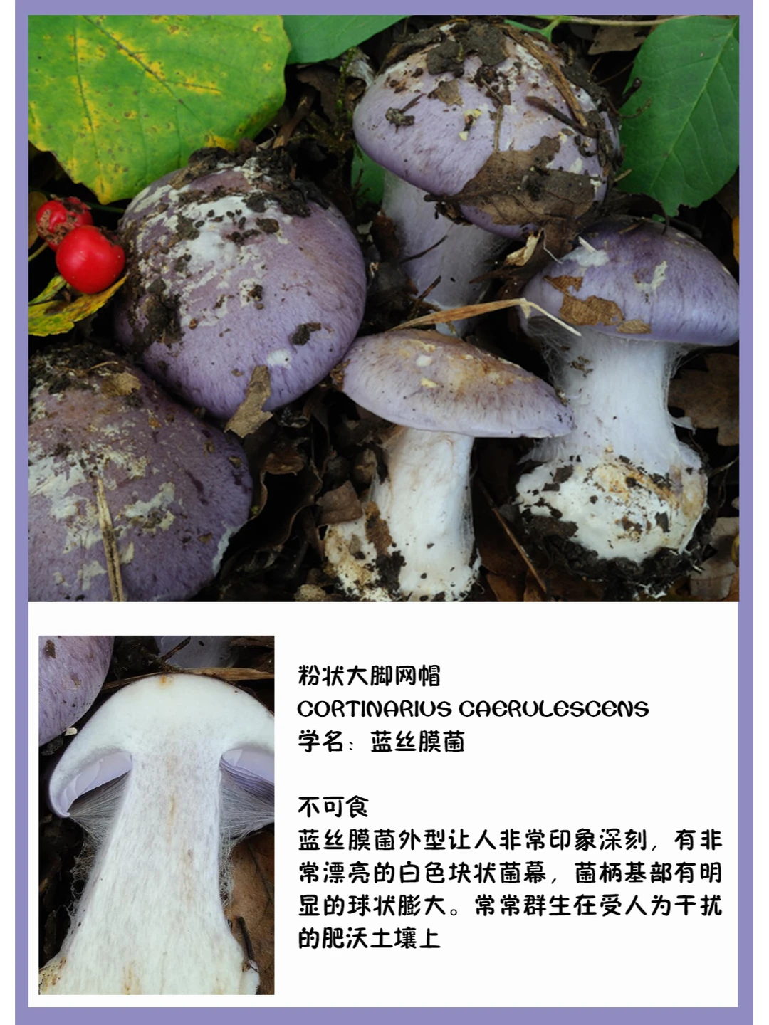 粉状大脚网帽 Cortinarius caerulescens 学名:蓝丝膜菌 不可食 蓝丝膜菌外型让人非常印象深刻,有非常漂亮的白色块状菌幕,菌柄基部有明显的球状膨大。常常群生在受人为干扰的肥沃土壤上