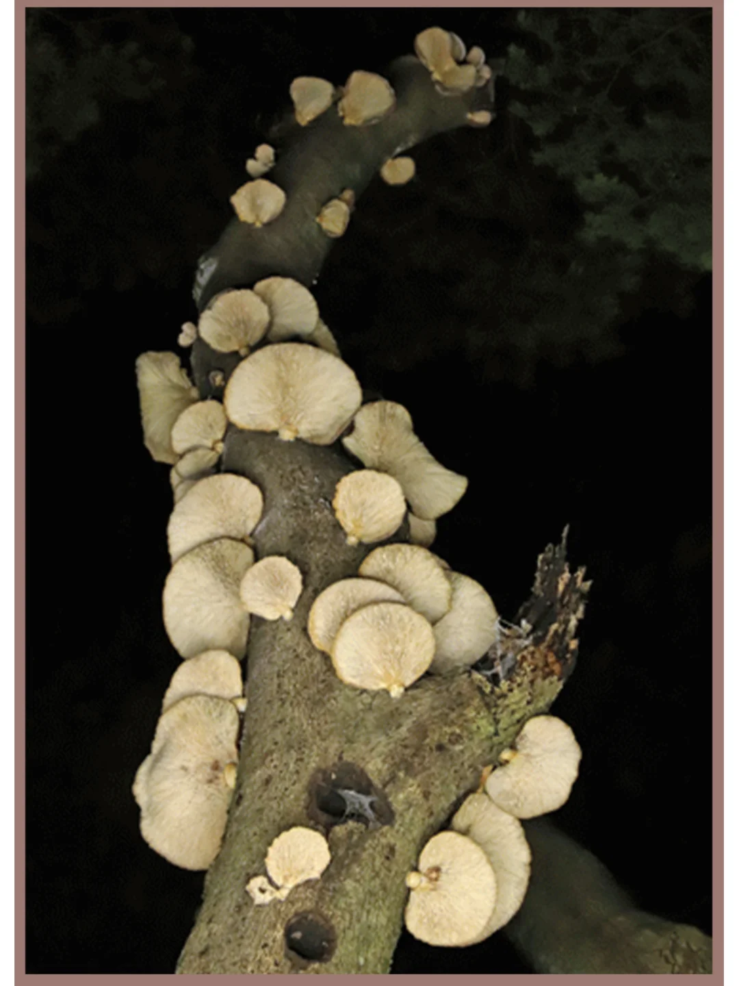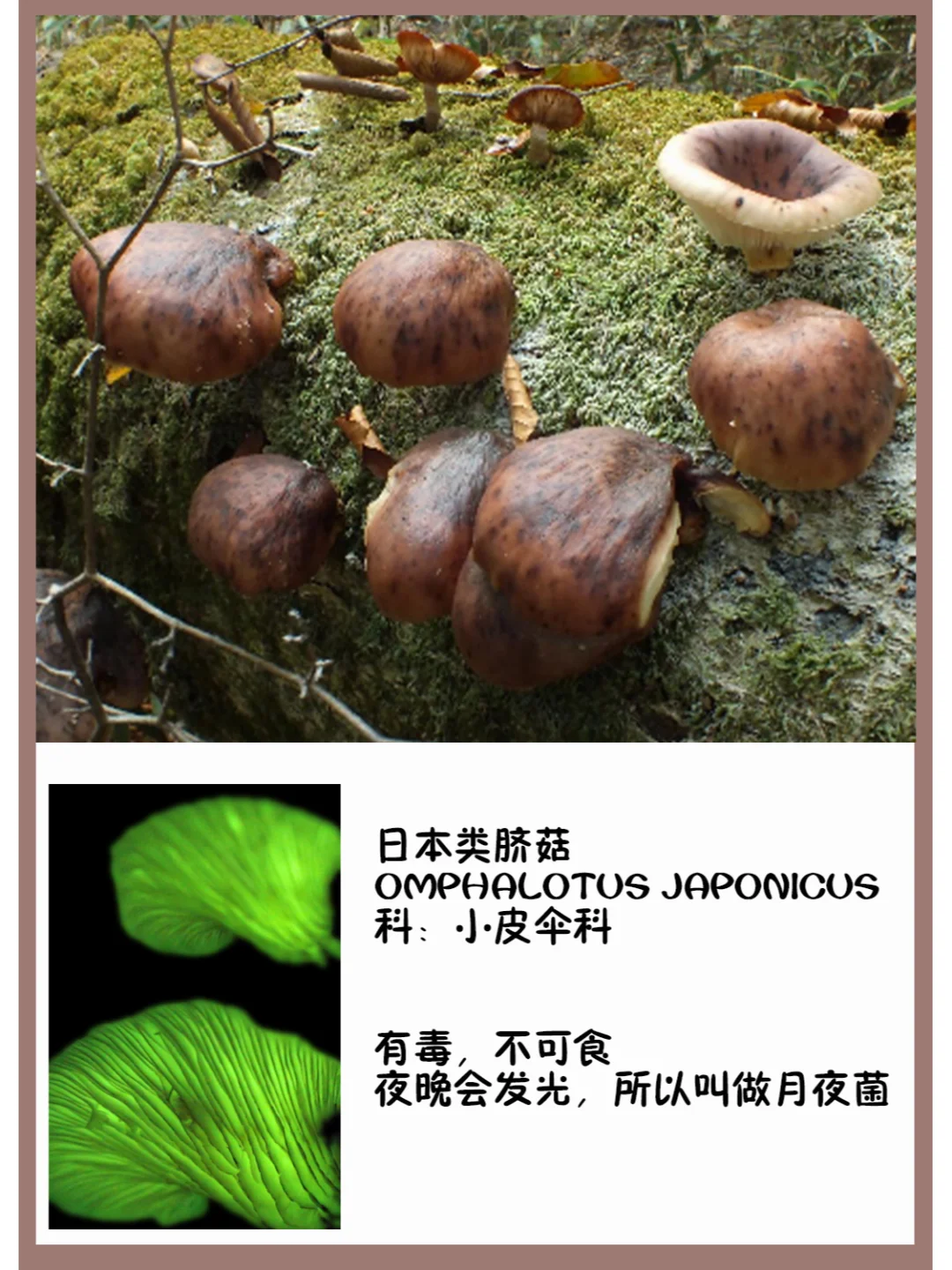 日本类脐菇 Omphalotus japonicus 科:小皮伞科 有毒,不可食 夜晚会发光,所以叫做月夜菌 含有细胞毒素隐杯伞素s或月夜蕈醇,这是一种具潜在抗癌作用的化合物