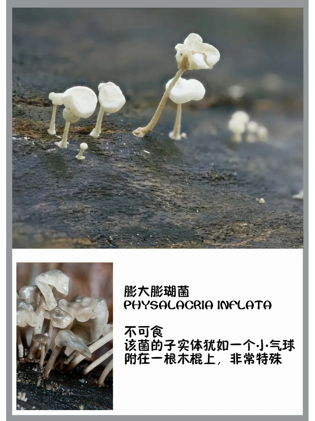 膨大膨瑚菌 physalacria inflata 不可食 该菌的子实体犹如一个小气球附在一根木棍上,非常特殊