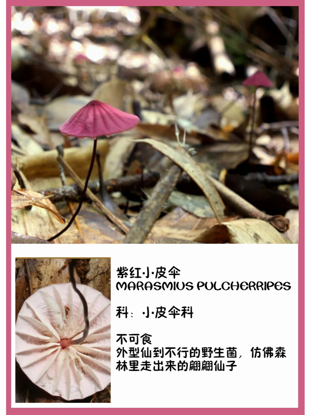 紫红小皮伞 Marasmius pulcherripes 科:小皮伞科 图片©manatarka.org ©josef hlasek ©oso 不可食 外型仙到不行的野生菌,仿佛森林里走出来的翩翩仙子 而且紫红小皮伞在干燥气候下也能存货,在下雨后很快复苏,安然无恙