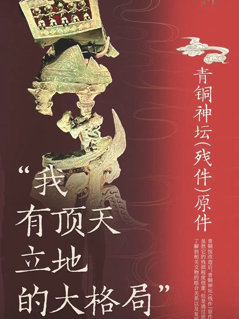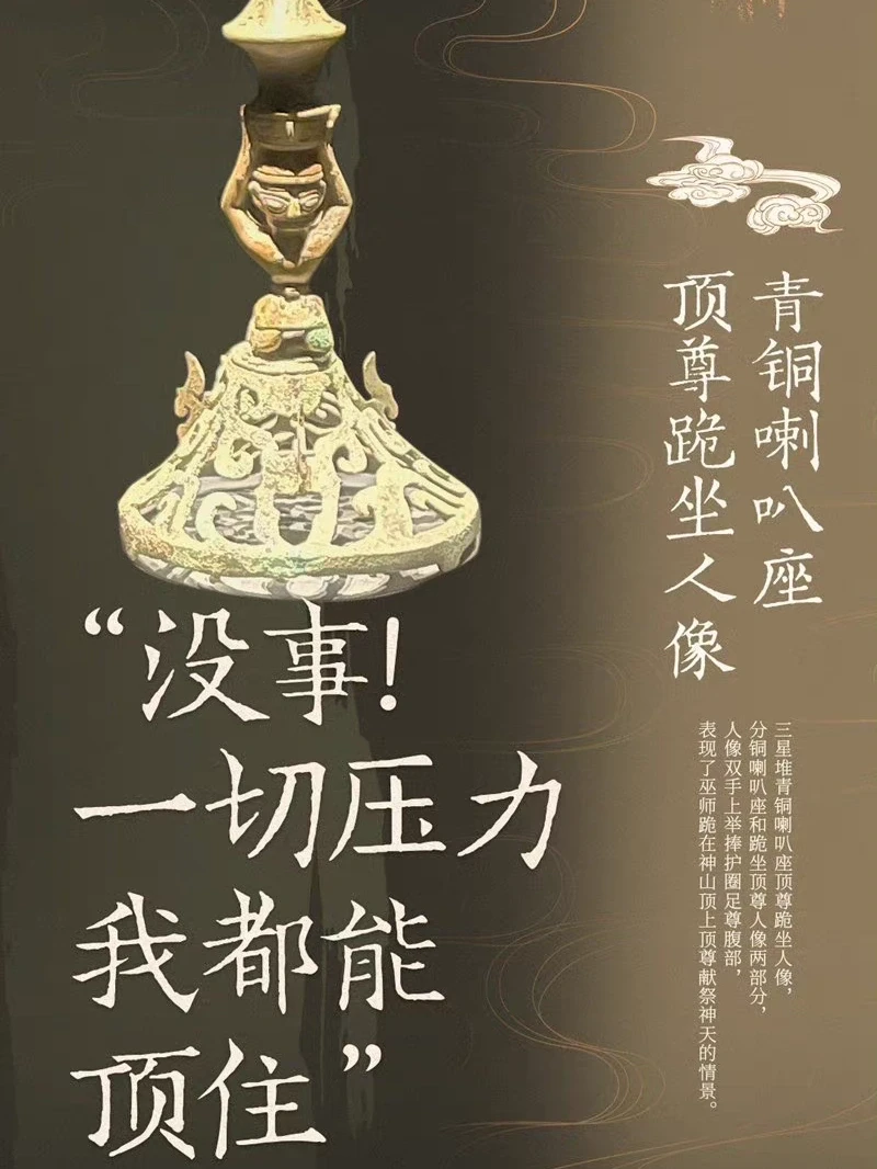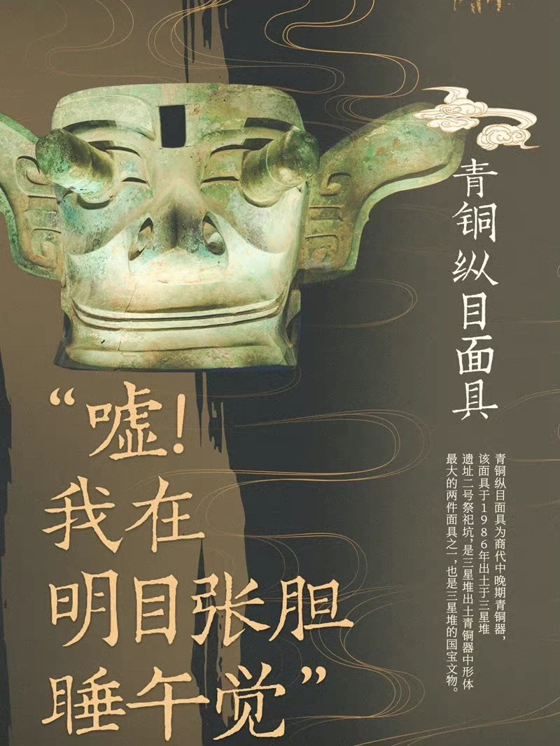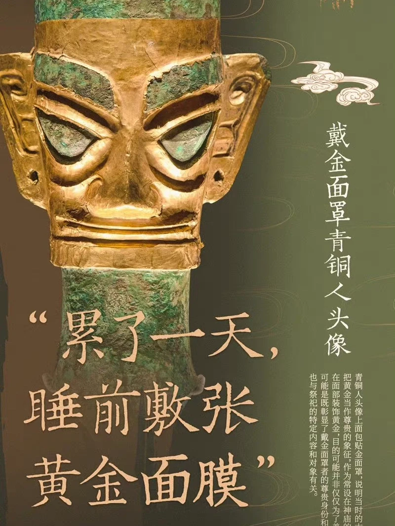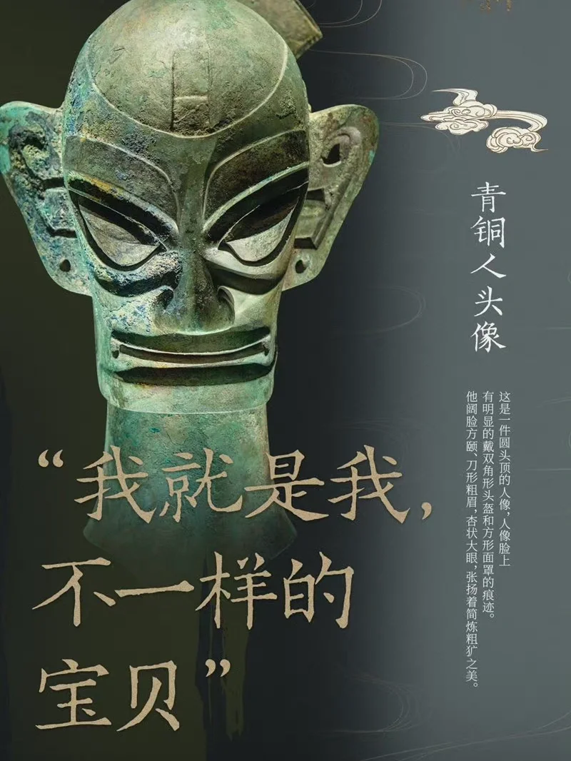 自20世纪30年代三星堆遗址被发现,一层层神秘的面纱现世,出土了大量举世闻名的珍贵文物,如青铜神树、青铜纵目面具、金杖等,引起世人瞩目。 近日,升级改造后的三星堆博物馆青铜馆恢复开放,分享一组创意海报,跟着“文物天团”一起学文案。 [害羞R]青铜虎:可爱是我装的,可,爱你是真的 [微笑R]青铜纵目面具:嘘!我在明目张胆睡午觉 [哇R]戴金面罩青铜人头像:累了一天,睡前敷张黄金面膜 [自拍R]青铜人头像:我就是我,不一样的宝贝 [赞R]青铜神坛:我有顶天立地的大格局 [大笑R]青铜跪坐人像:正襟危坐,才不会蹭花化好的妆