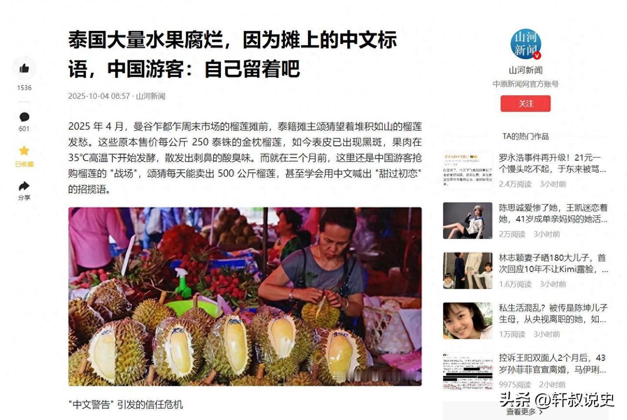 泰国大量水果腐烂,因为摊上的中文标语,中国游客:自己留着吧![嘘] 泰国当地的一些小贩真是得了便宜还卖乖,赚着中国人的钱,却瞧不起中国人! 今年4月,一位中国游客在清迈的街头,看到用加粗中文字体写就的标语:“按了就得买”。 在泰国清迈的一个榴莲摊前,一块用中文写的警示牌引起了人们的注意,牌子上直接写着“按了就得买”,语气显得生硬,而摊位上对应的英文提示则是“请勿挤压”,措辞礼貌,这种差异化的表达,让不少路过的中国游客感到不太舒服。 商贩有自己的苦衷,榴莲壳上的尖刺经过反复按压容易断裂,果肉暴露后便难以保存,影响销售,保护商品本是合理的出发点,但为何对不同语言的顾客使用了不同的沟通方式?这成了许多游客心中的疑问。 实际上类似的情况在疫情后的泰国旅游市场中并非孤例,从出租车议价、部分餐厅的定价,到一些景点和市场的消费,少数从业者的做法让部分中国游客感觉到自己被“区别对待”,这些点滴细节逐渐累积,最终让一块小小的标牌,成为了触发广泛讨论的触点。 市场数据或许能反映部分变化,中国一直是泰国水果的重要消费市场,约六成榴莲和七成山竹销往中国,但今年第一季度,赴泰中国游客数量同比有所减少,普吉岛等地酒店入住率和免税店销售额也出现下滑,曾经畅销的榴莲,在一些地方出现了销售放缓的情况。 面对市场变化,一些摊主也开始调整策略,原先强硬的标语被撤下,换上了“温柔按压,享受优惠”或“轻按一下,打折带回家”等更活泼的提示,有的商家甚至开发出“榴莲炖鸡”、“榴莲糯米饭”等新吃法,试图吸引顾客,游客们则感觉到,比更换标语更重要的,是服务心态和经营观念的真正转变。 与此同时,国内旅游市场提供了更多的选择,比如云南的西双版纳,凭借与泰国相似的热带风光、丰富的民族文化和更具竞争力的消费价格,吸引了许多原本计划出境游的旅客,人们在这里可以轻松体验到浓郁的热带氛围和夜市美食,而沟通上的无障碍更是增添了便利。 更值得注意的是,海南的榴莲产业近年来发展迅速,随着种植技术的成熟,国产榴莲今年迎来量产,价格相比进口榴莲更有优势,特别是“树上熟”技术的推广,保证了榴莲的口感和新鲜度,让消费者有了“家门口”的新选择,这对于喜爱榴莲的游客来说,无疑多了一份吸引力。 这场由一块标牌引发的讨论,折射出当下游客对旅行体验的更高期待,旅行不仅仅是为了购买特产或品尝美食,更在于过程中的感受与互动。 最近泰国水果摊的中文警示牌事件在网上引发热议,不少网友分享了自己的看法。 "现在选榴莲跟拆盲盒一样,按一下就要买单,这规矩比高考还严格。" "如果担心水果被按坏,可以放几个样品让顾客试手感,或者用更礼貌的提示语,直接写'按了就得买'确实让人不舒服。" "去年在曼谷买榴莲,轻轻按了一下想看看熟没熟,老板立刻冲过来指着中文牌子,可旁边几个欧美游客同样在挑挑拣拣,老板却笑脸相迎,这种区别对待最让人生气。" "现在泰国消费确实不便宜,一盘水果动辄上百元,如果服务还区别对待,确实会影响旅游心情。" "游客要遵守当地习惯,商家也要注意表达方式,毕竟大家都是想愉快交易。" "规矩对所有人都一样,大家都能接受,但如果只对某些人特别严格,就难免让人感觉被针对。" "现在国内水果选择很多,海南榴莲又便宜又新鲜,何必非要大老远跑去受气?" "同样的热带风情,服务态度好多了,价格也更实在。" "每个地方都有好商家和不好的商家,不能以偏概全。但商家也要明白,现在游客选择很多,好的服务才是长久之计。" 话说回来,你在旅行中有没有遇到过类似的情况?你觉得商家应该怎样表达规定会更让人接受?欢迎在评论区分享你的看法。 信息来源:光明网