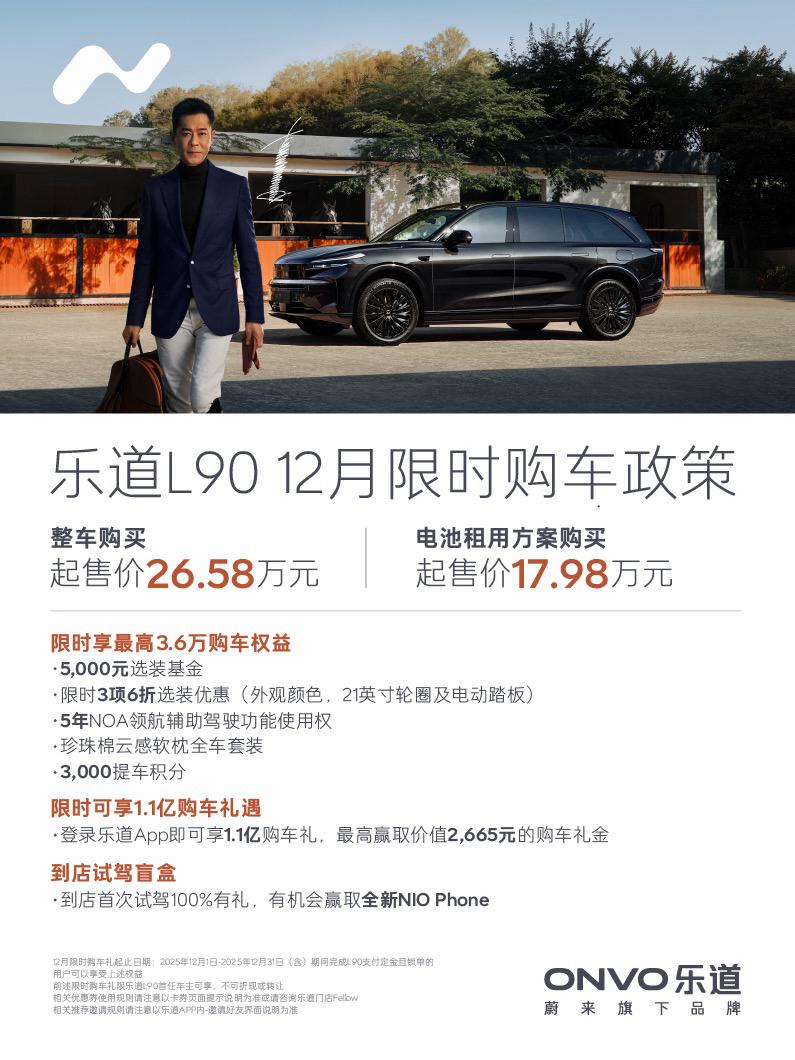 之前去商场看乐道,加了销售的微信,他们倒是很积极,总是会发一些关于乐道汽车优惠的政策,又来了这次。 乐道L6012月现车抢购重磅礼遇,限时可享1.1亿购车礼遇登录乐道App参与抽奖100%有礼最高赢取价值2,665元购车礼金 到店试驾100%有礼首次试驾赢取价值5,999元 NIO Phone~ 购车立省至高4.1万元 0首付起3年0息金融方案| 5年免费NOA领航辅助|3年免费换电|「云感舒享」套装| 3,000提车积分 购置税立省至高1.1万元|即刻下单享购置税全免 仔细看看他里面的优惠还是挺吸引人,特别是下单购置税全免,三年是0息,还有三年的免费换电,还有一些套装可以送 确实还是力度挺大的,现在是L90的比较好,L60在90面前差一点点气,那对于目前的乐道品牌而言,他也一定会着重去推乐道L90,我身边的几个同学都选择了L90。 不过这个福利是有时间段的,就是一整个十二月份(2025年12月1日-2025年12月31日期间),我不知道十一月份的时候是啥政策,反正总觉得现在买车真不是什么先下单先优惠,总之随时都可能会有一个捡漏。