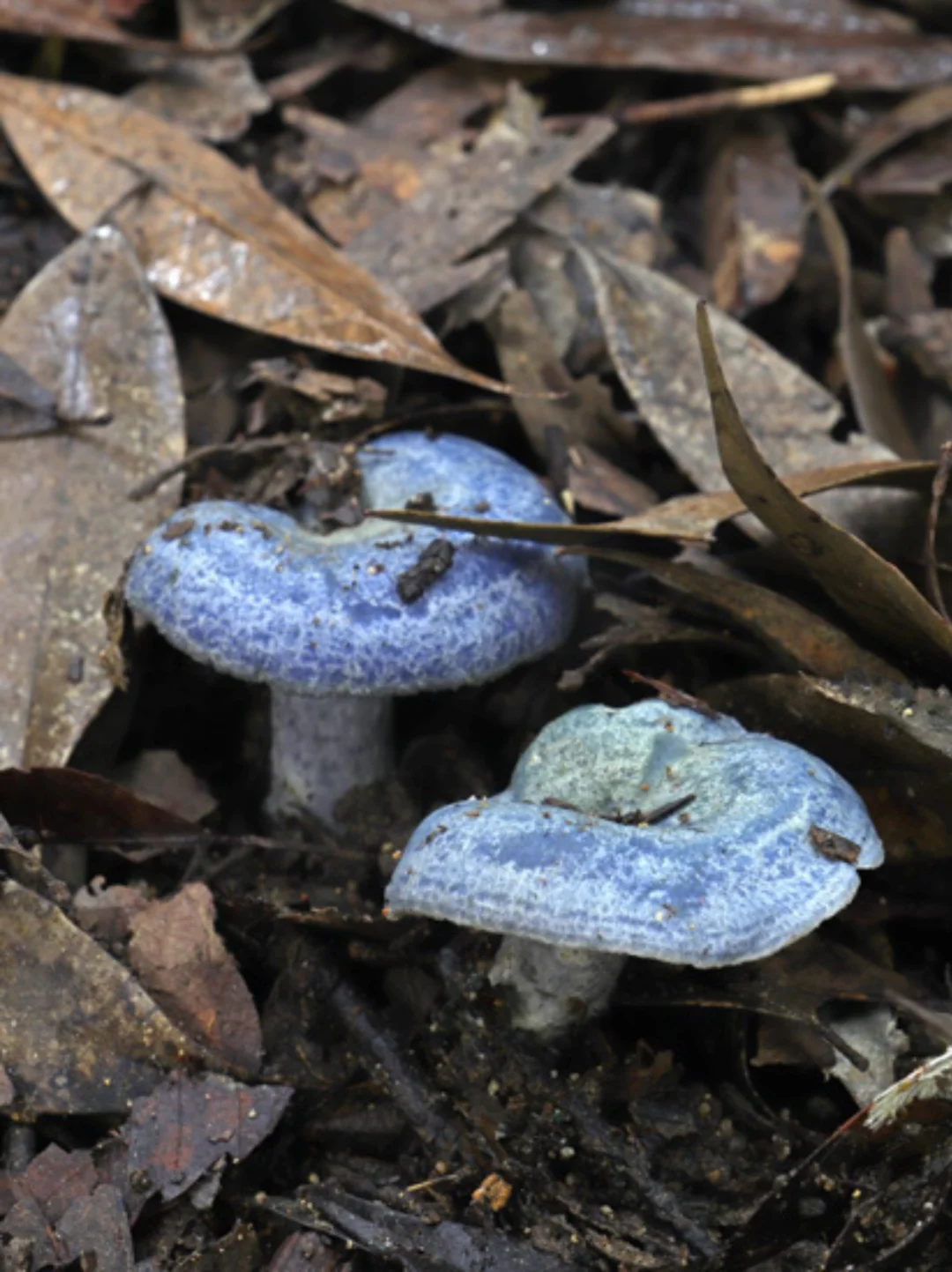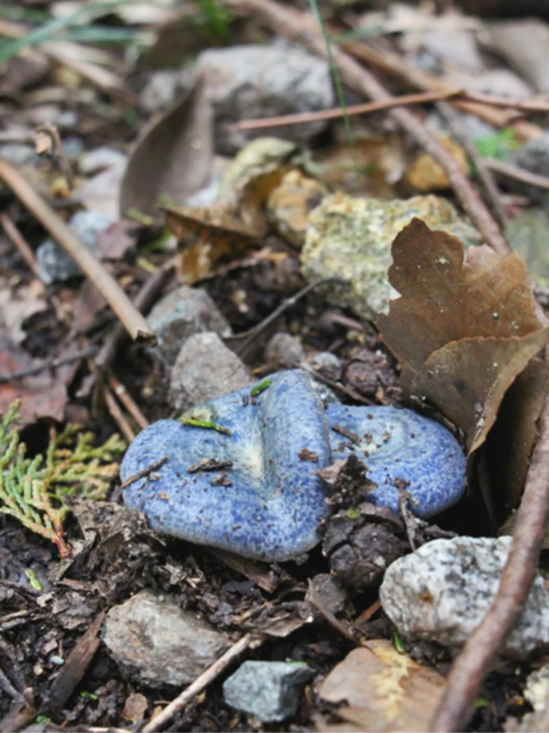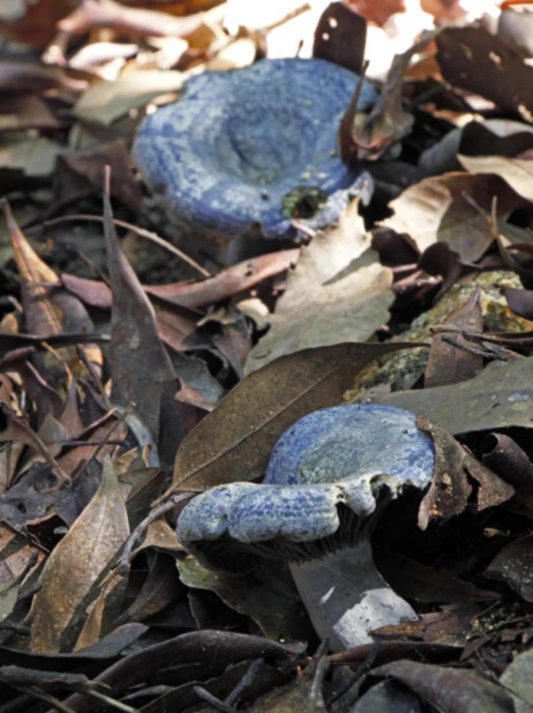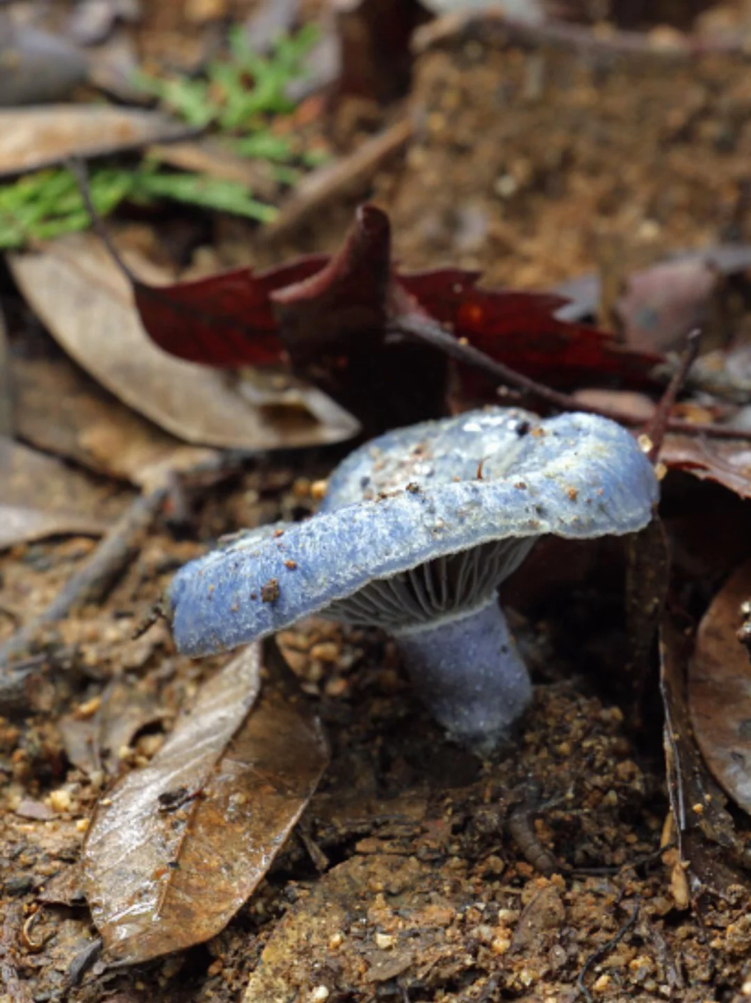 菌盖:幼时深蓝色,成熟后渐变为 灰蓝色至蓝灰色,直径 5–15 cm,表面湿润,边缘内卷。