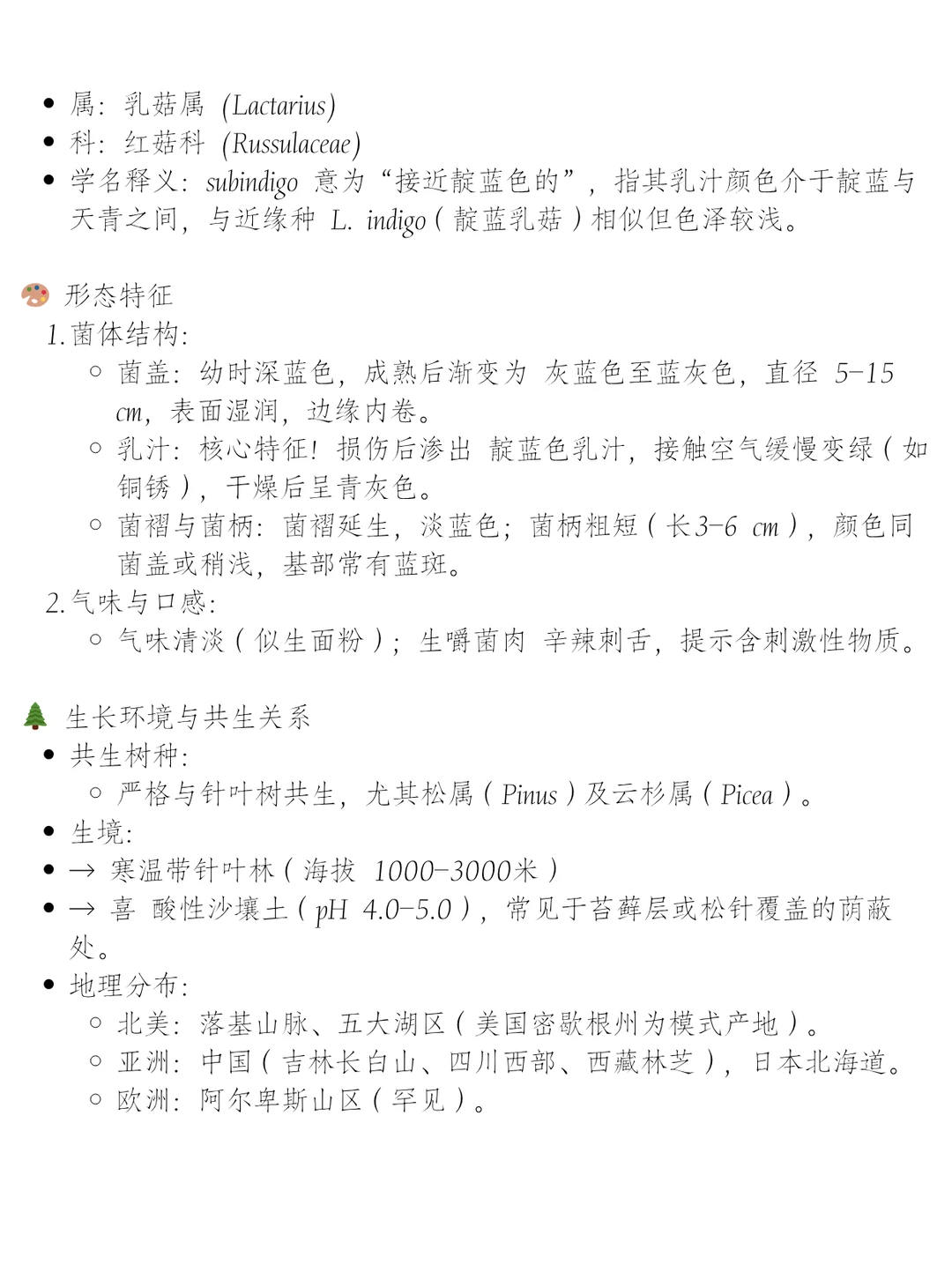 学名释义:subindigo 意为“接近靛蓝色的”,指其乳汁颜色介于靛蓝与天青之间,与近缘种 L. indigo(靛蓝乳菇)相似但色泽较浅。