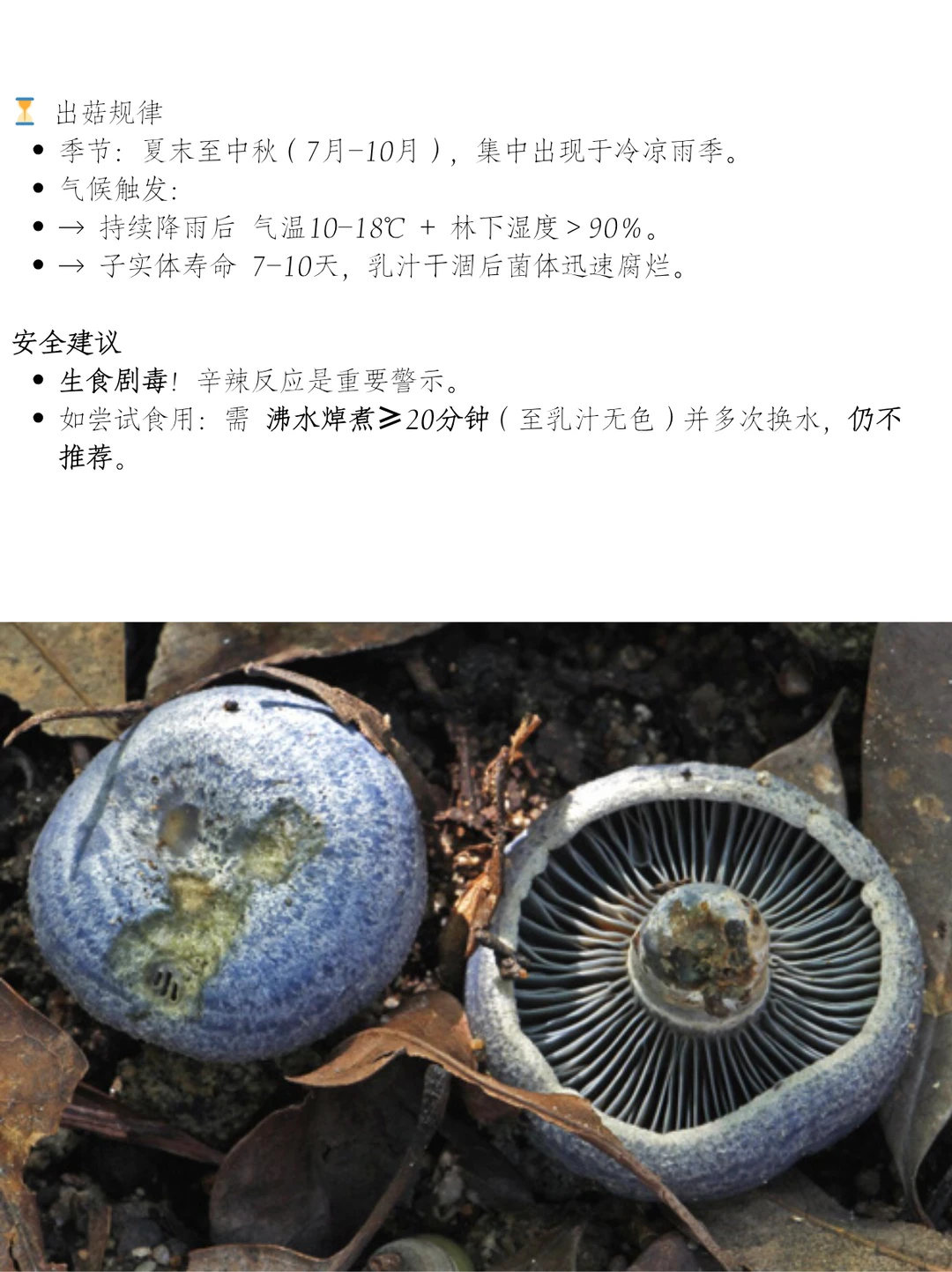 → 子实体寿命 7–10天,乳汁干涸后菌体迅速腐烂。