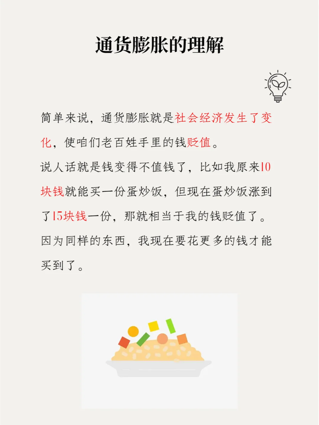 比如我原来10块钱就能买一份蛋炒饭,但现在蛋炒饭涨到了15块钱一份,那就相当于我的钱贬值了因为同样的东西,我现在要花更多的钱才能买到了[哭惹R]。