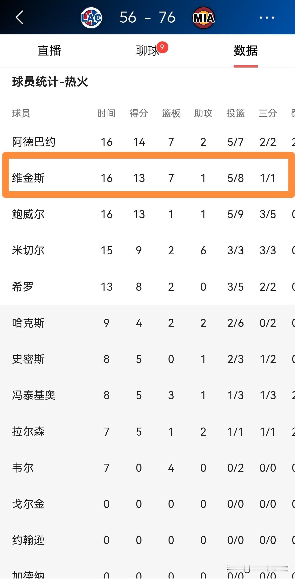 我忍不住要怒赞热火球星维金斯!在今天热火主场迎战快船的比赛中,目前双方半场战罢,热火以76:56领先对手20分。值得一提的是,在前两节比赛中,维金斯真的是攻防俱佳,他在首发出战的16分钟里,投篮8中5,其中三分球1中1、罚球2中2非常高效的砍下13分7篮板2盖帽,他的场上正负值为+18。 实事求是的说,维金斯绝对是热火能够在上半场比赛结束时大比分领先快船的大功臣,他对伦纳德的防守非常成功。