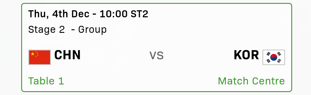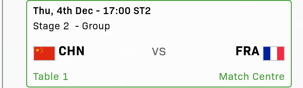 比赛安排:12.3 13:00 T1中国vs克罗地亚12.4 10:00 T1中国vs韩国12.4 17:00 T1 中国vs法国中国队加油乒出精彩2025年成都混合团体世界杯