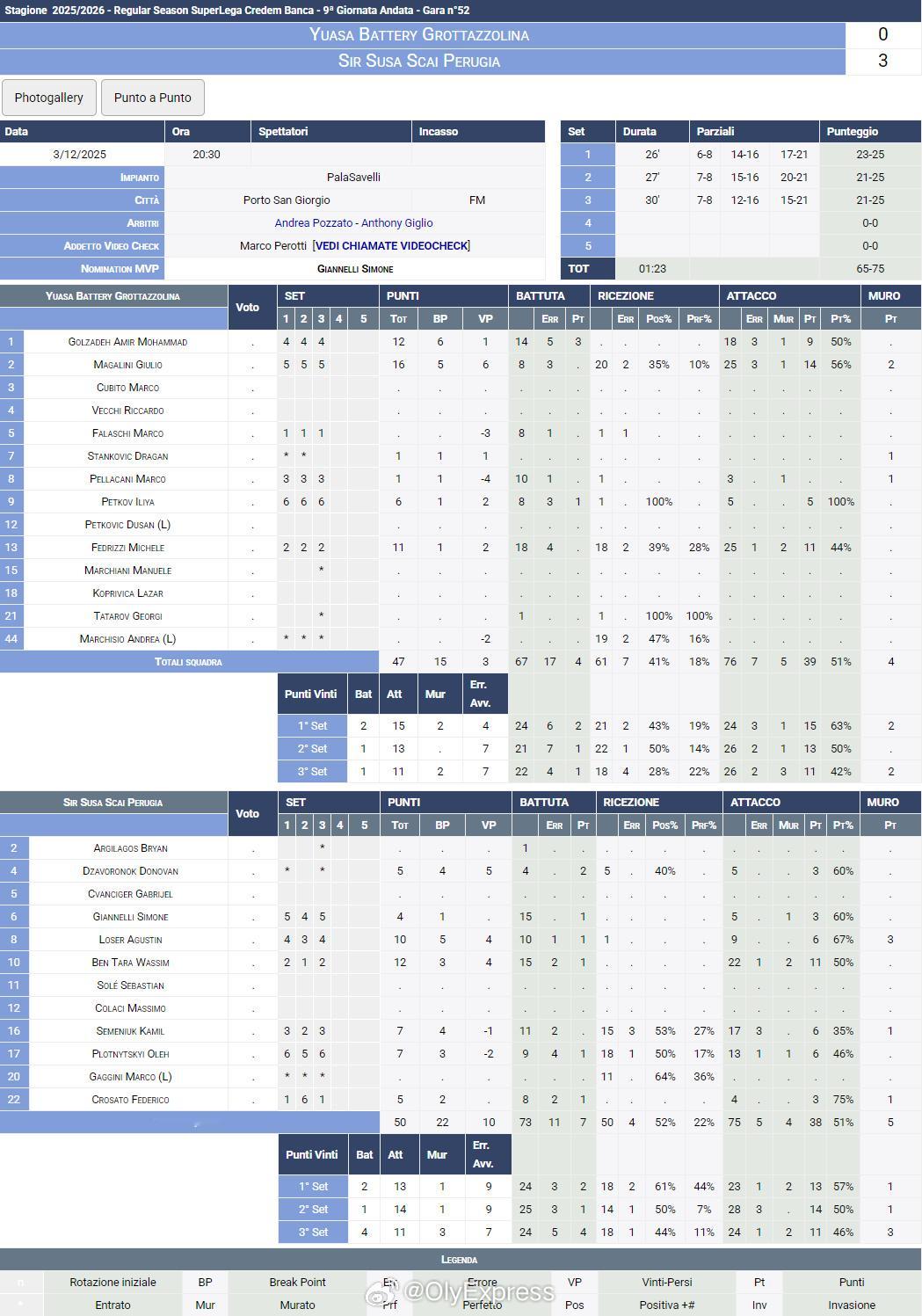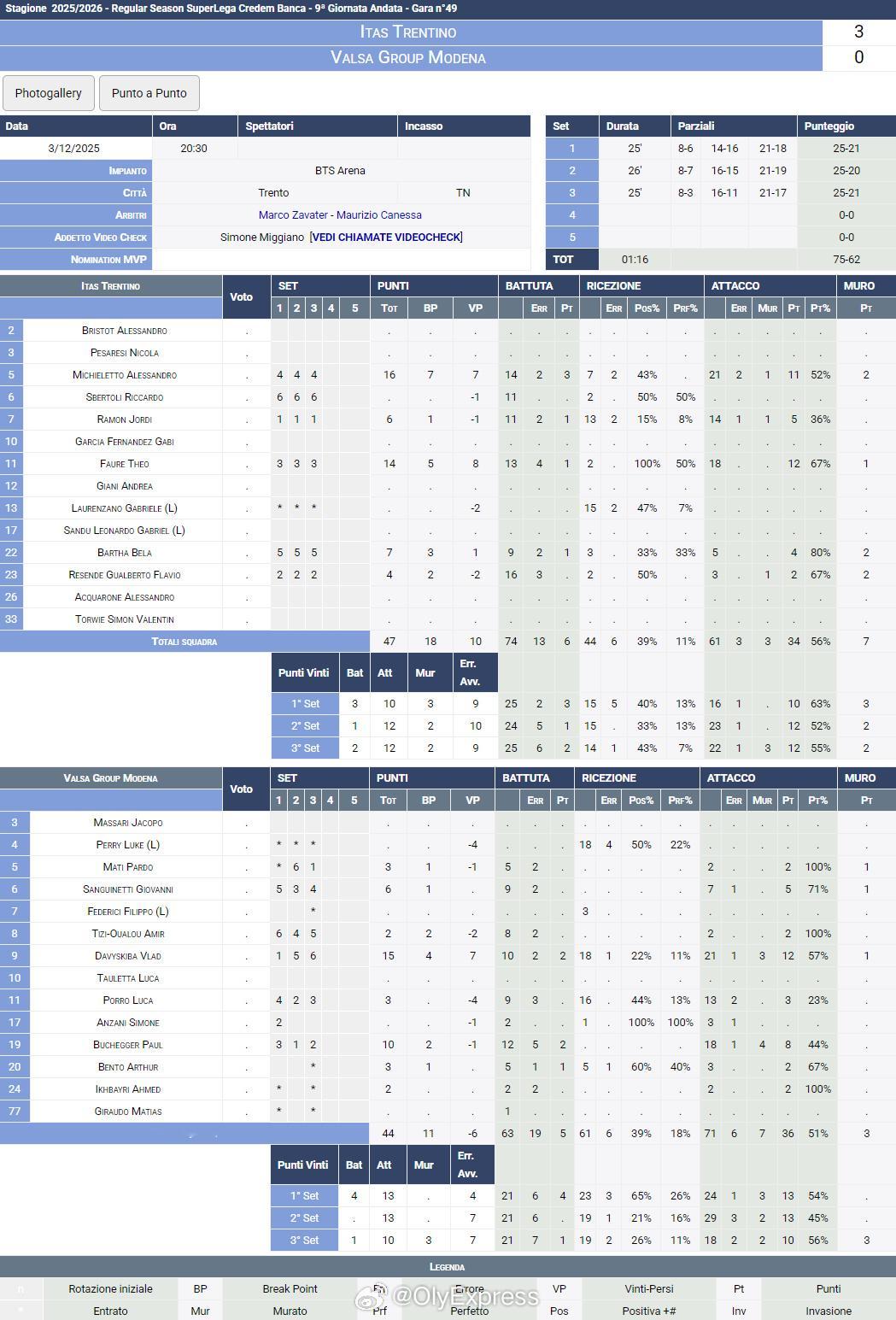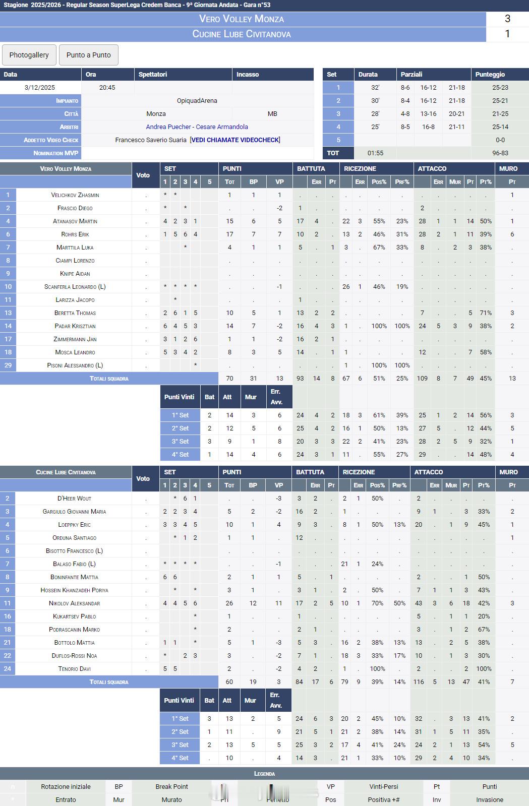 【意超男排蒙扎爆冷3-1击败奇维塔诺瓦 尼科洛夫空砍26分】 国际排坛战报速递 12月3日,意超男排第九轮,排名倒数第二的蒙扎主场爆冷,3-1(25-23/25-21/21-25/25-14)击败排名第四的奇维塔诺瓦,取得赛季第二胜。罗尔斯17分、帕达尔14分、贝雷塔10分、自由人斯坎费尔拉荣膺MVP,尼科洛夫26分、洛普基10分。其余赛果如下(主队在前):特伦蒂诺3-0(25-21/25-20/25-21)摩德纳维罗纳3-0(25-19/25-20/25-18)希斯特纳皮亚琴察3-0(25-21/25-20/25-18)帕多瓦格罗塔佐利纳0-3(23-25/21-25/21-25)佩鲁贾