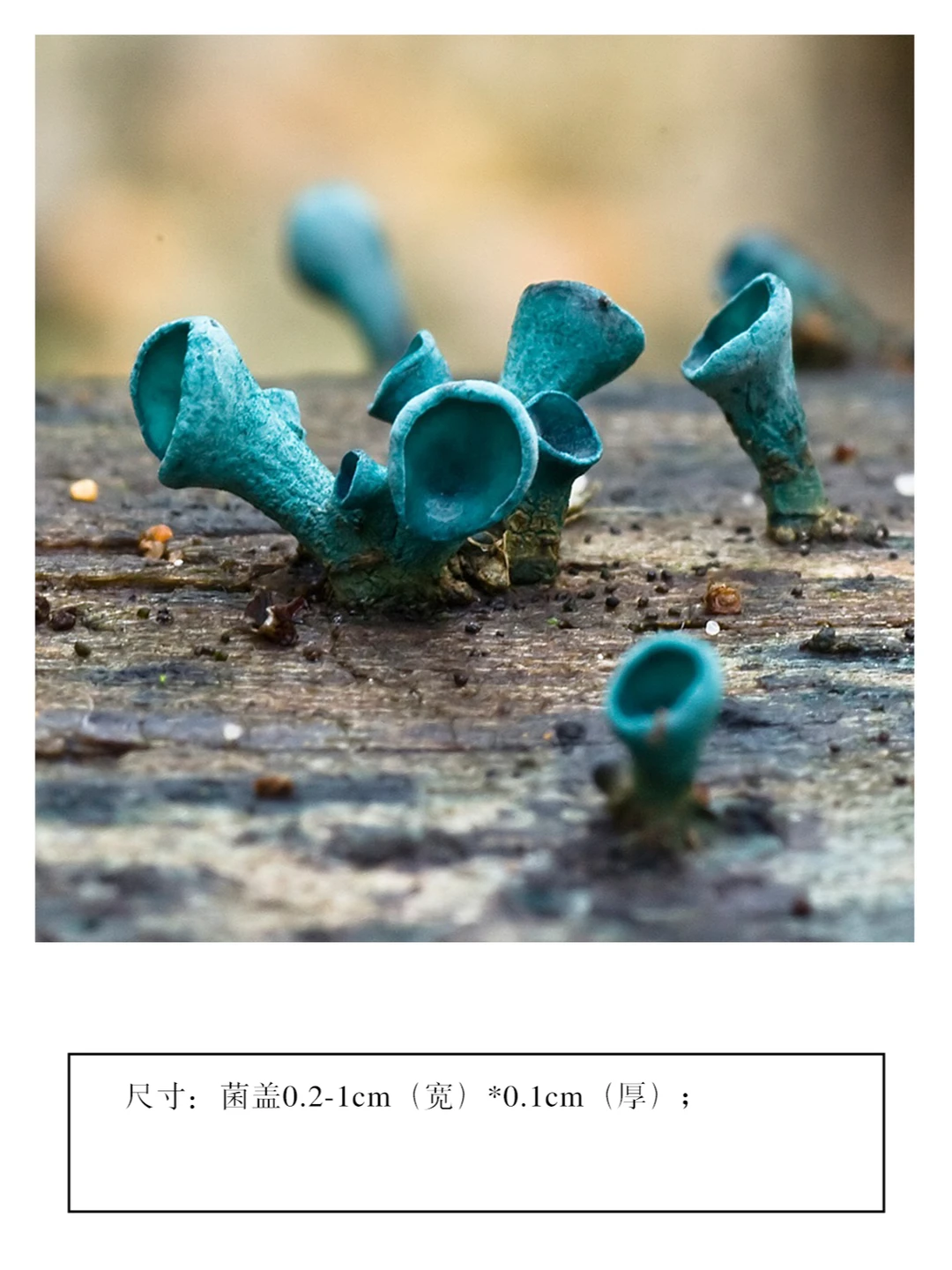 1.菌盖:子囊盘小,呈小盘、碗状或近漏斗状,蓝绿色,外侧色稍浅,内层色深,边缘稍内卷或呈波状,蜡质,干时近革质