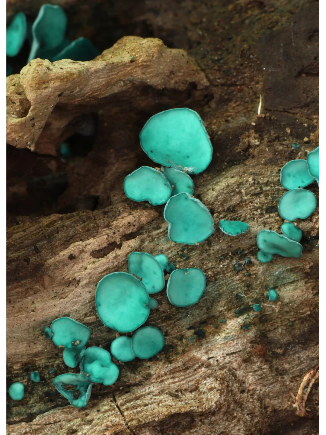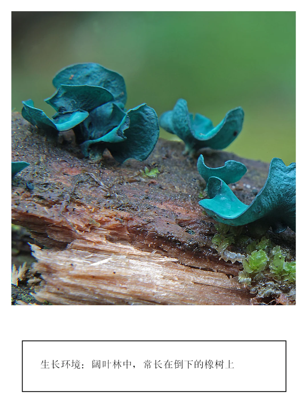 🌲 生长环境:小孢绿杯盘菌,学名Chlorociboria aeruginascens,属于绿杯盘菌科真菌。它们通常在温带森林中生长,尤其是在腐烂的木上