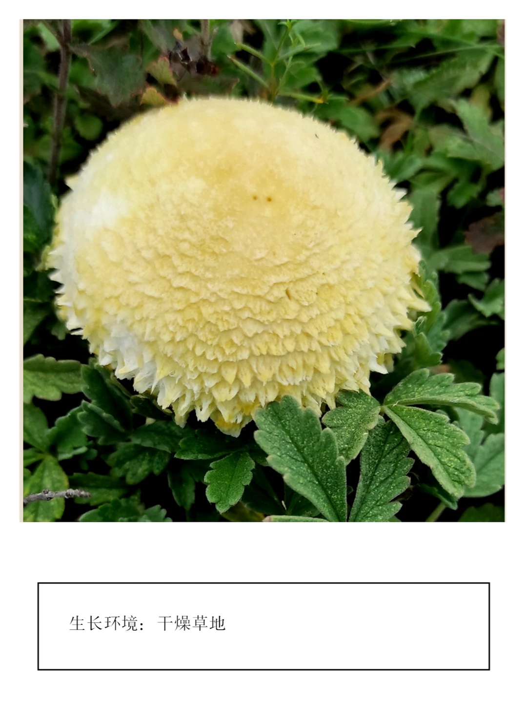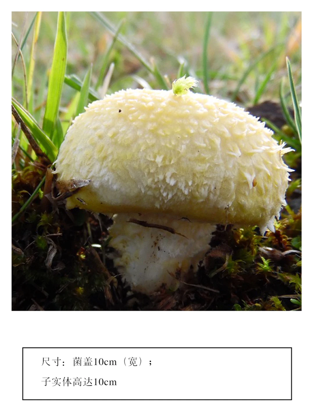 菌盖:初期呈球形,成熟后展开呈扁平状,直径5-13厘米,幼时鲜黄色,成熟后或经阳光长时间照射后呈淡黄色或白色