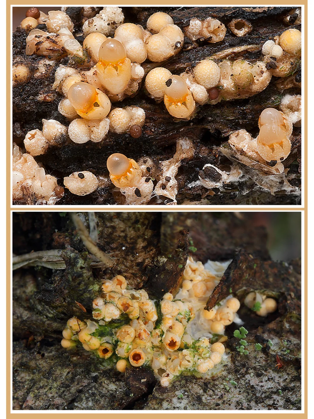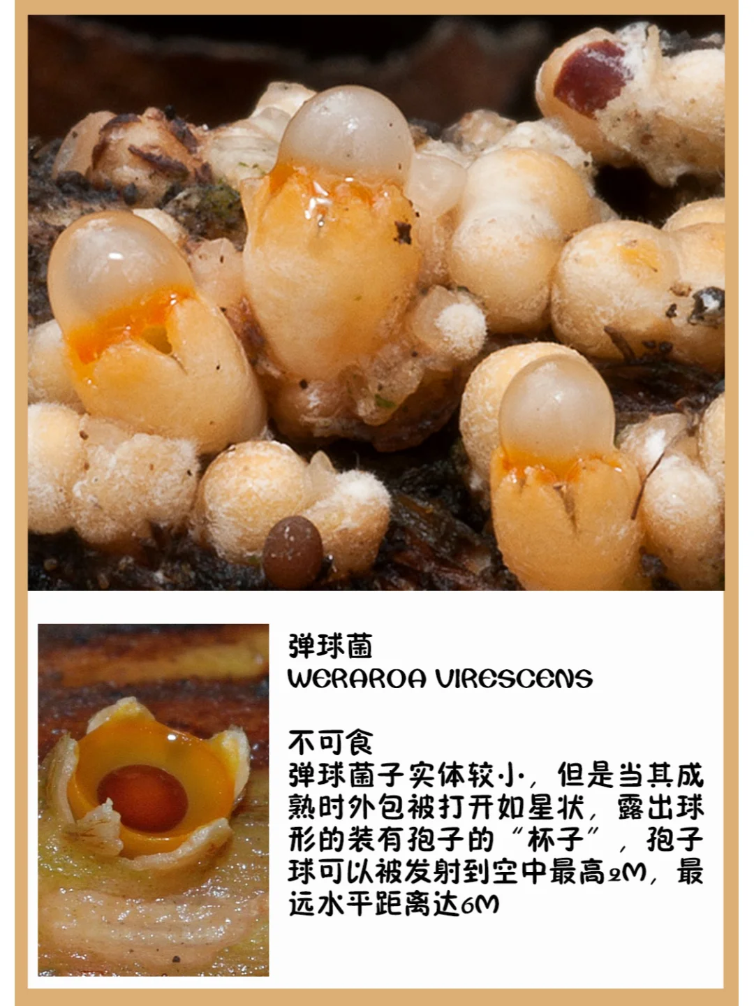 弹球菌 weraroa virescens 不可食 弹球菌子实体较小,但是当其成熟时外包被打开如星状,露出球形的装有孢子的“杯子”,孢子球可以被发射到空中最高2m,最远水平距离达6m