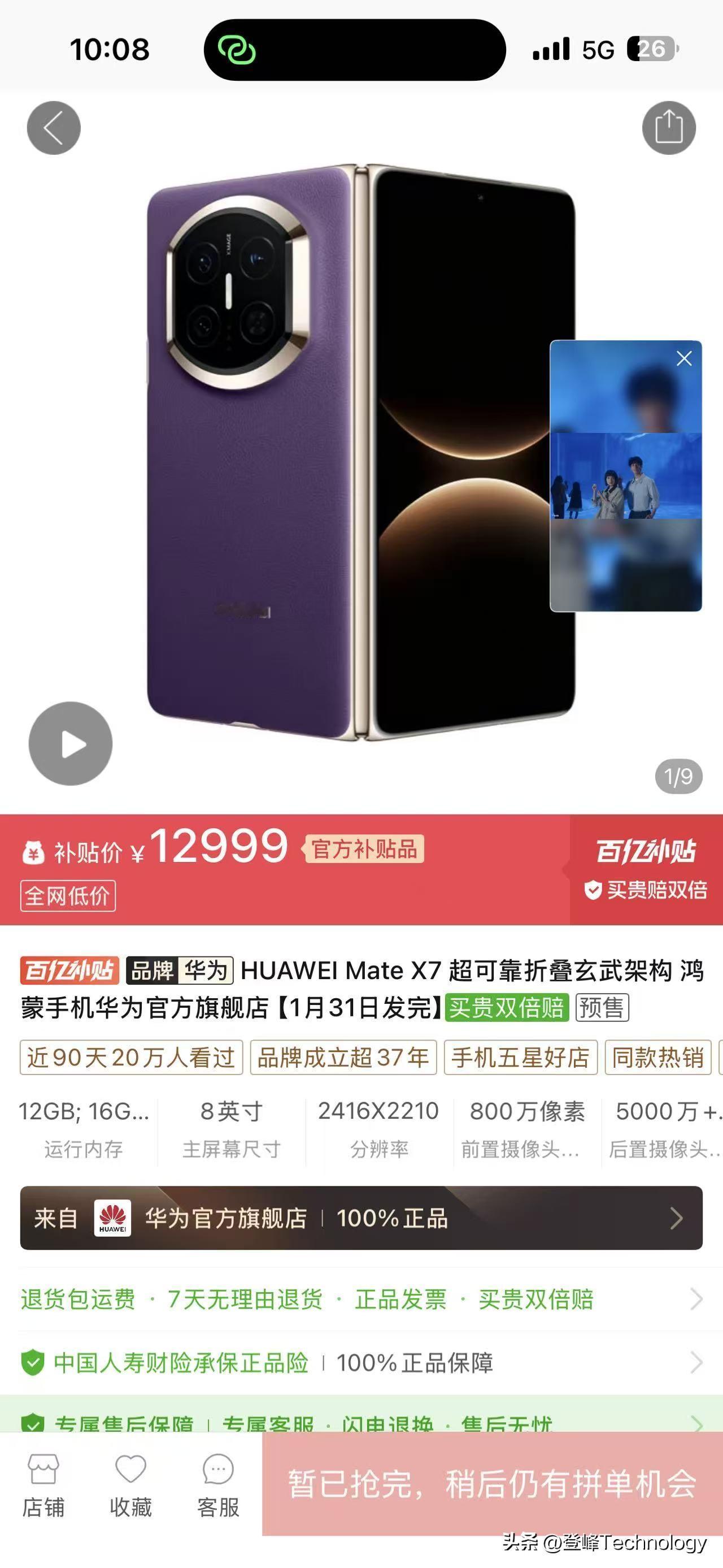 厉害了,在12月5日10:08,华为全新折叠旗舰Mate X7正式开售,线下门店氛围火爆,线上各销售平台快速售罄。 华为Mate X7堪称华为尖端技术的集大成者,外观上突破性融入非遗“云锦”肌理,除了素皮材质,云锦白和云锦蓝两个颜色把千年非遗云锦工艺融入后盖,编织的手感也不错,真的很难让人不爱。同时还搭载全新超可靠折叠玄武架构,从根本上提升整机耐用性与可靠性。配备第二代红枫原色镜头,可实现全场景高保真色彩还原,轻松定格专业级大片。 首发搭载鸿蒙6,系统流畅度与智能化体验超棒;小艺智能体首次商用A2A智能体协作,交互更便捷;12G + 256GB售价12999元、12GB + 512GB售价13999元,一共有五个版本供大家选择。你还在等什么,赶紧去买吧!华为新款折叠屏全色售罄 华为MateX7开售门店火爆 华为Mate X7开售即告罄