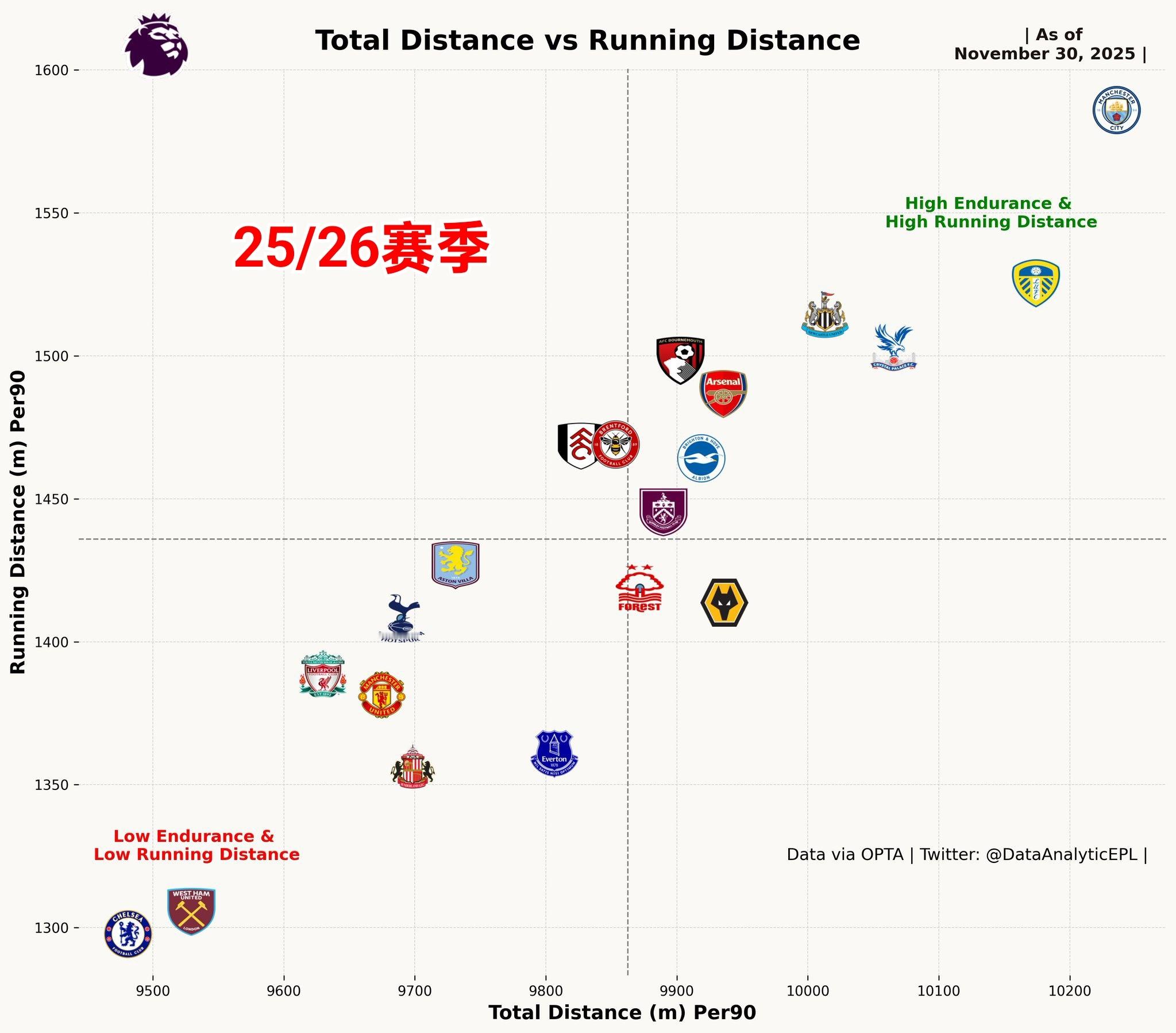近2个赛季英超球队每90分钟跑动距离统计(x轴包括走到距离),切尔西一如既往的稳定。