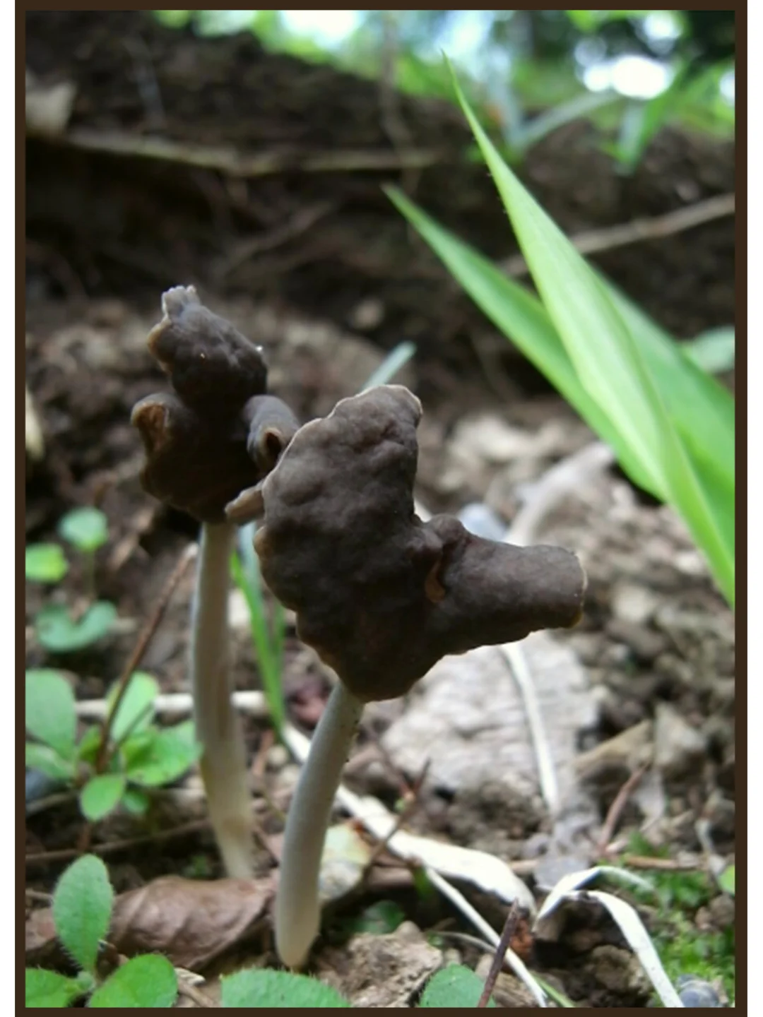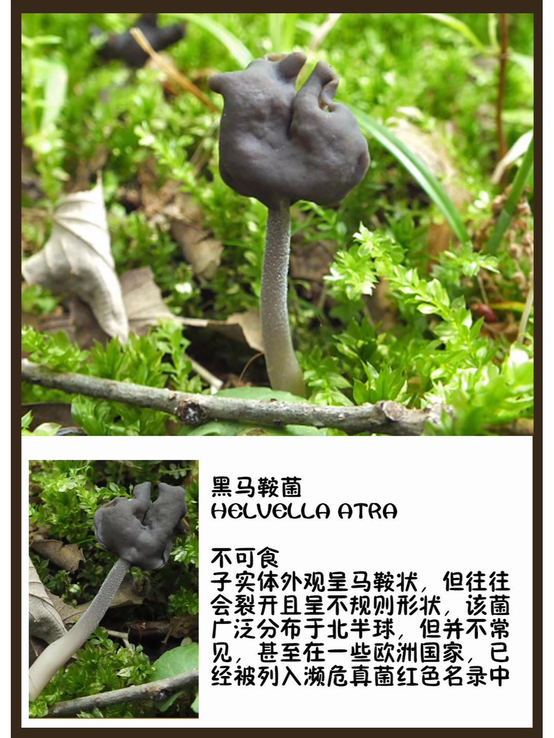 黑马鞍菌 Helvella atra 不可食 子实体外观呈马鞍状,但往往会裂开且呈不规则形状,该菌广泛分布于北半球,但并不常见,甚至在一些欧洲国家,已经被列入濒危真菌红色名录中