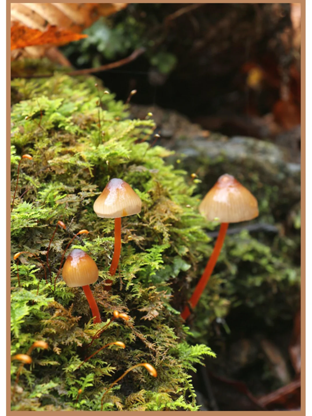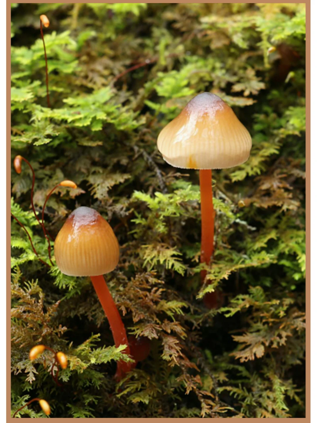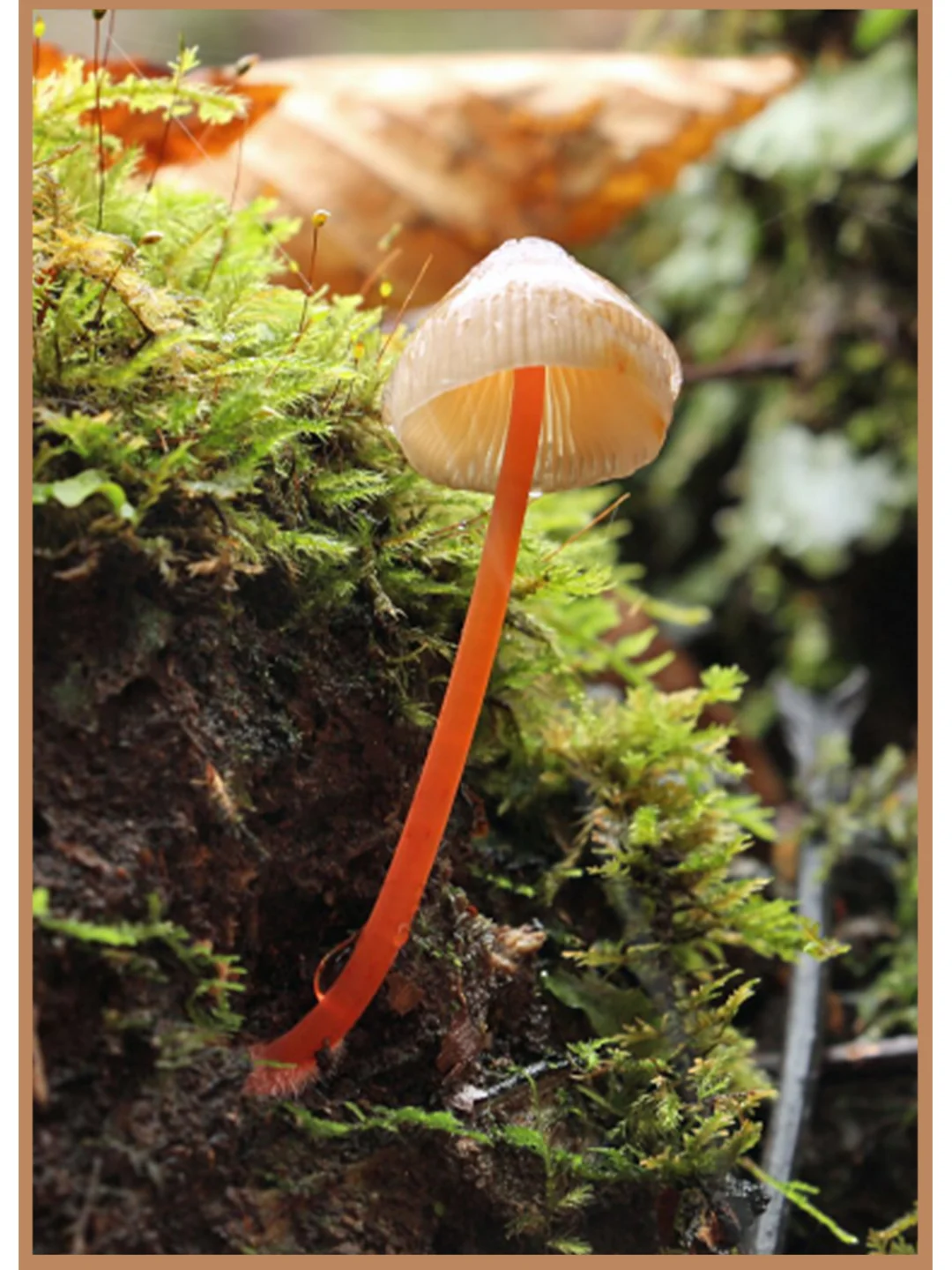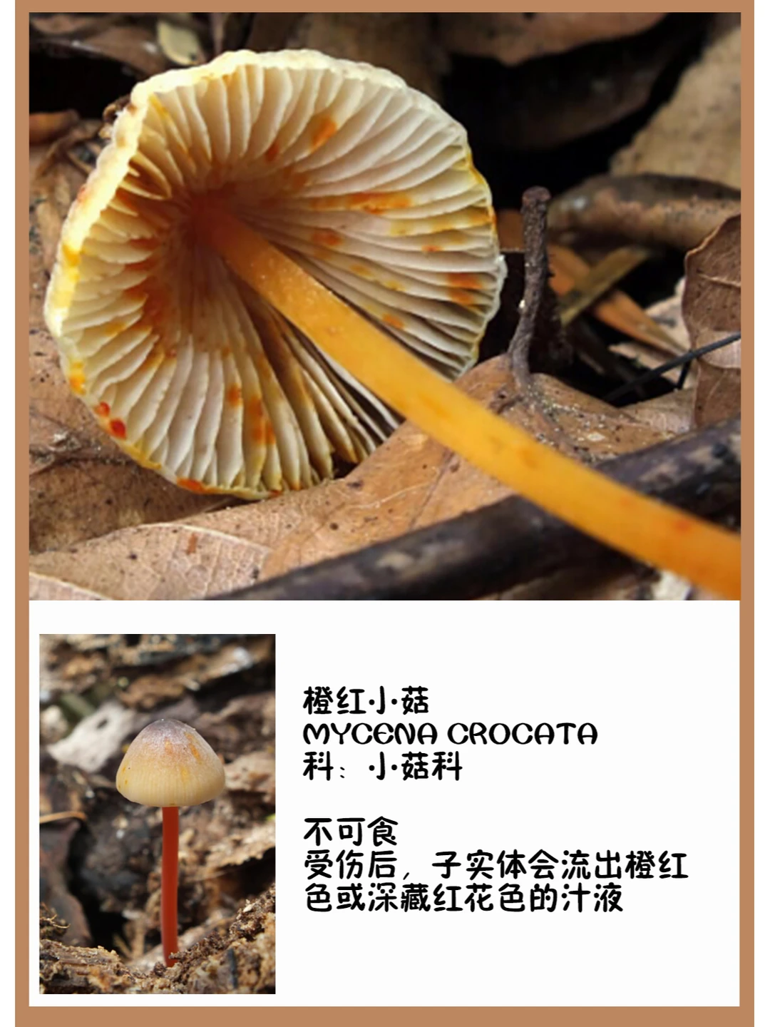 橙红小菇 Mycena crocata 科:小菇科 不可食 受伤后,子实体会流出橙红色或深藏红花色的汁液