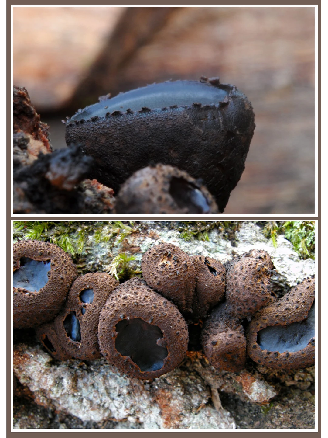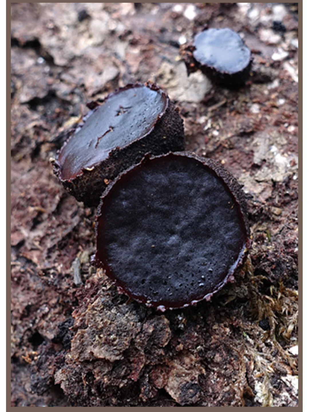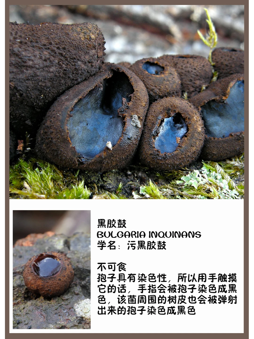 黑胶鼓 Bulgaria inquinans 学名:污黑胶鼓 不可食 孢子具有染色性,所以用手触摸它的话,手指会被孢子染色成黑色,该菌周围的树皮也会被弹射出来的孢子染色成黑色