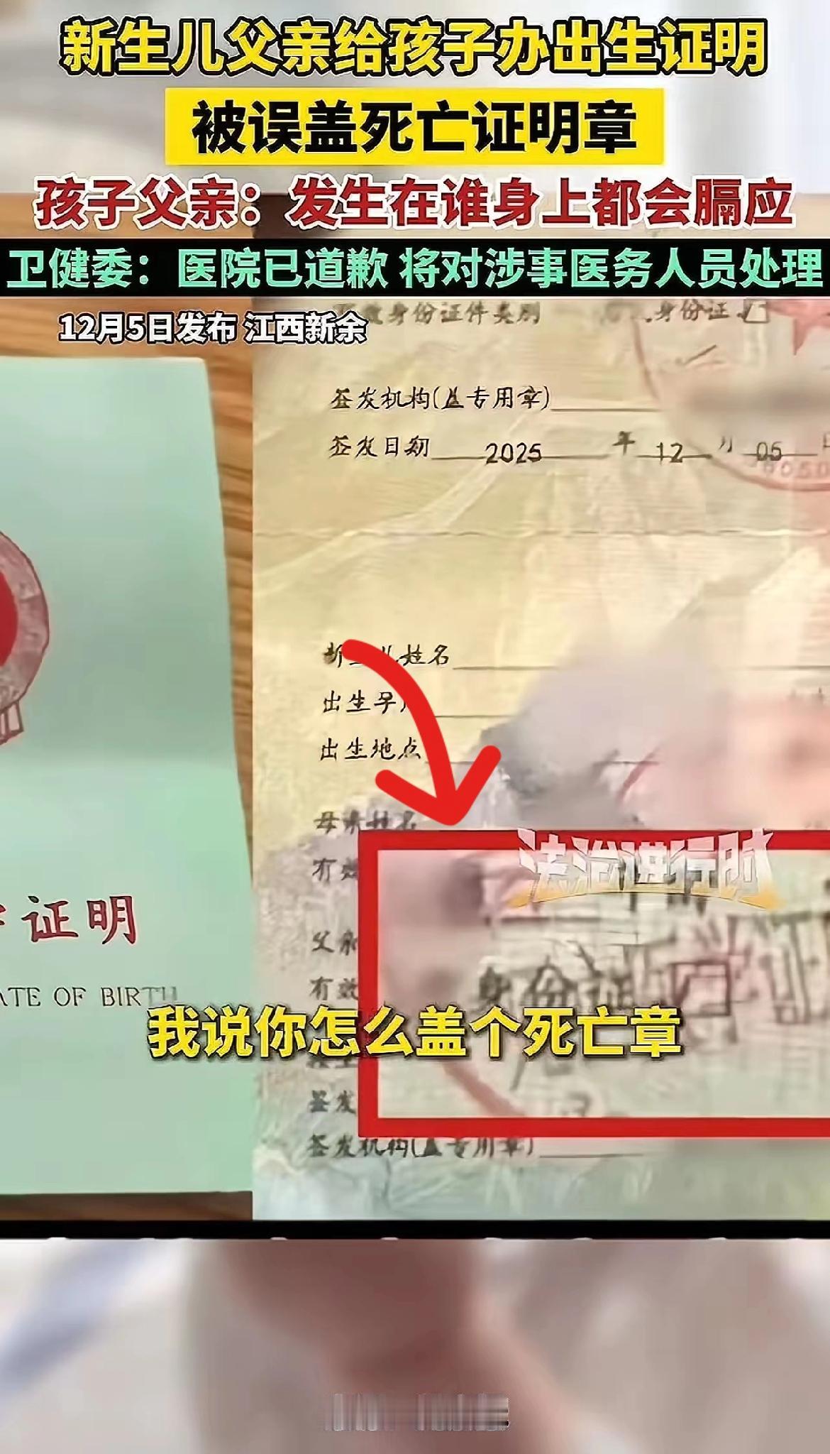 惊掉下巴!新生儿出生证明盖"死亡章" 医院一句"不小心"就想打发人? 12月5日江西新余 黄先生家刚添了个白白胖胖的小子 全家围着宝宝乐开了花 他揣着满心欢喜去医院办出生证明 结果打开证件的瞬间 笑容直接僵在脸上 好好的出生证明上 居然戳着个鲜红的"死亡证明"印章 那红印子跟烙铁似的 看着刺眼又膈应 黄先生气得直跺脚 直言这不是咒刚降生的孩子吗 刚出生的宝宝 人生第一份凭证就出这岔子 换谁都接受不了 出生证明是宝宝的"人生入场券" 死亡证明是生命终结的凭证 俩东西差着天壤之别 工作人员坐在办公室里 就抬手盖个章的简单活儿 居然能犯这种低级错误 网友看完直接炸锅 这哪是不小心 分明是干活走神走得没影了 更让人窝火的是 涉事方一开始就用"不小心"三个字轻飘飘搪塞 压根没把家长的感受当回事 事件曝光后 新余市卫健委连夜发了通报 说高度重视这事 立马核实还责令医院整改 医院也赶紧找黄先生一家道歉 处理了相关责任人 现在双方已经和解 但这事儿真能这么轻易翻篇吗 公职岗位的每一个操作 都连着老百姓的切身利益 尤其是这种关乎生老病死的证件 一丝马虎都可能造成大伤害 一句"不小心"背后 藏的是管理漏洞和责任心缺失 连盖章都能敷衍 老百姓还能放心把重要事托付给他们吗 你觉得这种失误只靠道歉就够了吗 来评论区聊聊你的看法