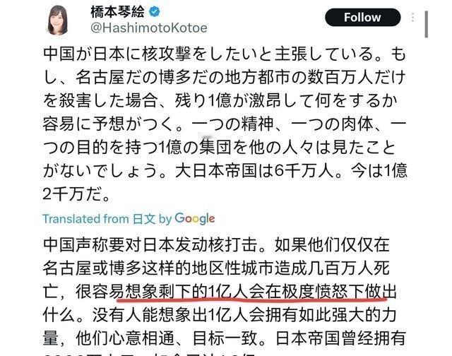 日本极右翼分子桥本琴绘表示,有人声称中国想对日本发动核攻击。如果只杀害名古屋、博多等地的地方城市数百万人,不难预想剩下的1亿人会愤怒地做出什么事。恐怕其他人从未见过拥有同一精神、同一肉体、同一目标的1亿人的集团吧!大日本帝国当年有6000万人,如今已经有1.2亿人了。 桥本琴绘那番话,核心就是假设中国核攻击日本局部城市,像名古屋博多那种,几百万老百姓没了,剩下的一亿多日本人会炸锅。她说,这帮人会怒火中烧,团结成一团,有共同信念、身体和目标,从没见过这么大规模的集体行动。比起大日本帝国那六千万人口,现在一亿两千万,力量大多了。这话一出,推特上炸了锅,支持的右翼叫好,反对的说她煽动仇恨。 先说背景,她是广岛人,自称被爆三世,却推日本核武装。这言论不是空穴来风,日本右翼圈子总爱拿历史说事,帝国时代那股子劲头,现在人口翻倍,就觉得能重来。名古屋博多这些地方,为什么挑它们?因为不是首都,攻击这儿伤不致命,但够刺激民众。桥本的意思是,局部打击会让幸存者觉醒,全国像一台机器转起来。工人回厂,妇女做旗,孩子传信,整个国家齿轮咬紧。 这想法接地气吗?日本现在人口老龄化,一亿两千万听起来多,但实际劳动力少。帝国时代六千万,全是壮劳力,军国主义洗脑下真能拉起大队伍。现在呢?年轻人玩游戏多过练兵,社会和平惯了,突然来核弹,谁知道反应咋样。桥本忽略了现代日本的现实,经济靠出口,社会靠福利,一轰就散。但她的话戳中右翼痛点:中国崛起,日本得硬起来。核攻击假设,不是真情报,是她借来鼓劲。 想想日本历史,帝国那会儿,宣传机器牛,民众真信鬼神附体。现在推特时代,一条帖几万转,影响力不小。桥本的粉丝多中年男,失业或退休的,爱听这种“复兴”调调。她说一亿人同一精神,像军队,但现实中,日本抗议游行都懒得去。博多名古屋那些城市,工业重镇,炸了经济崩,但她觉得这会激发“帝国魂”。这逻辑有漏洞,日本战后靠美伞,现在美中贸易纠缠,日本夹缝里,核武装喊得响,干得少。