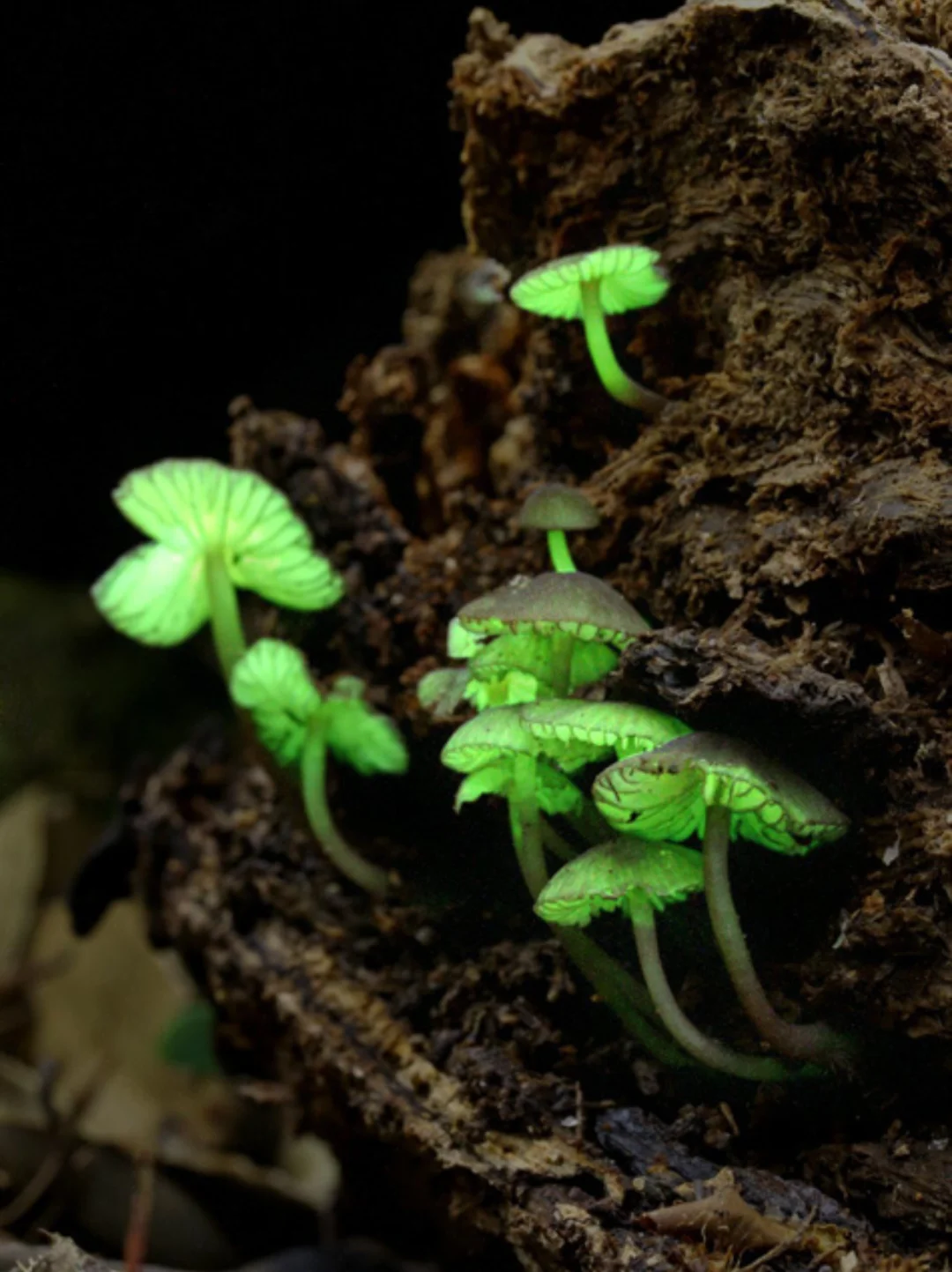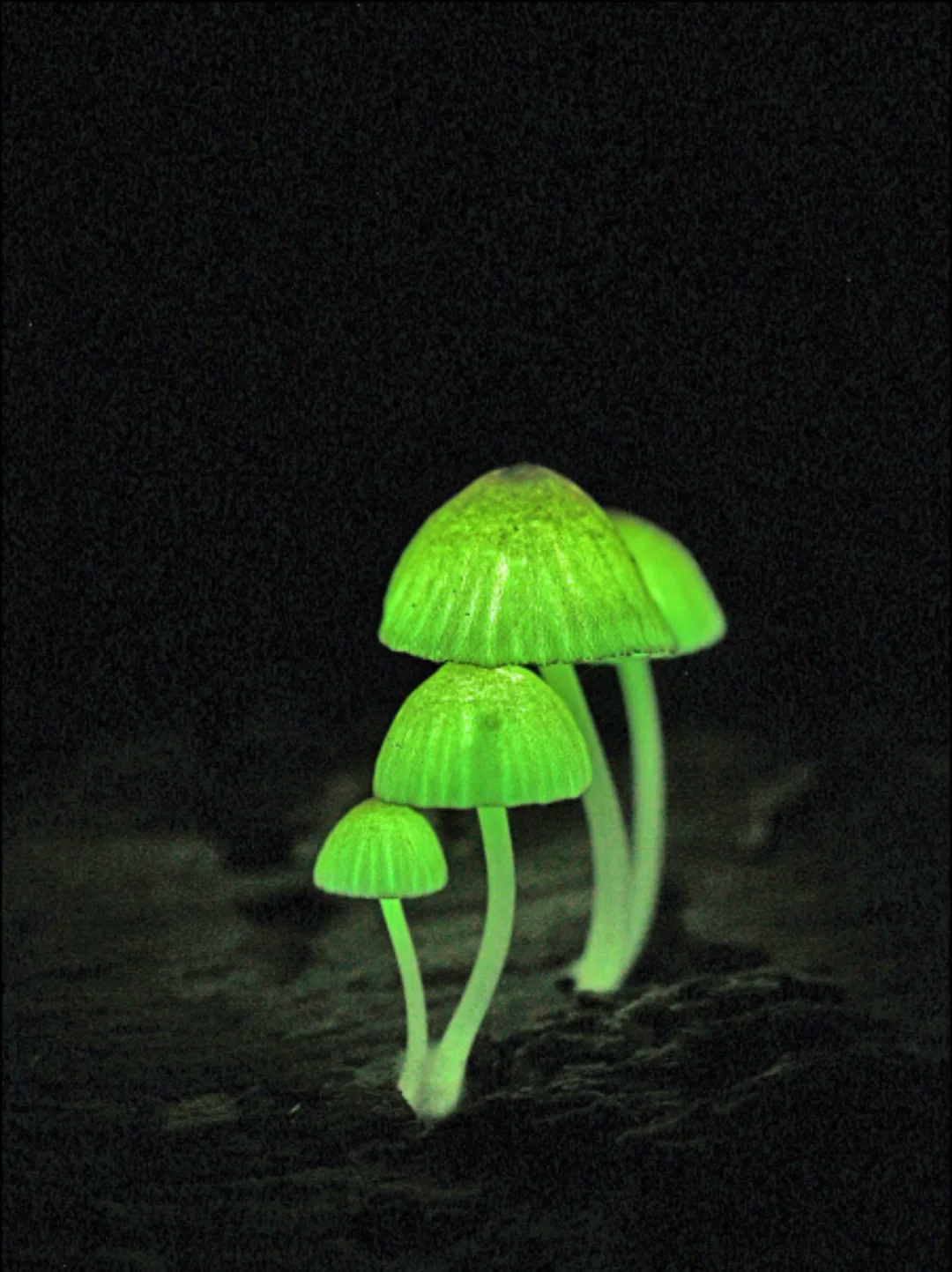 黑暗中出现强烈淡绿色荧光,尤其菌褶部位发光最明显,远看如“森林中的绿色星群”。