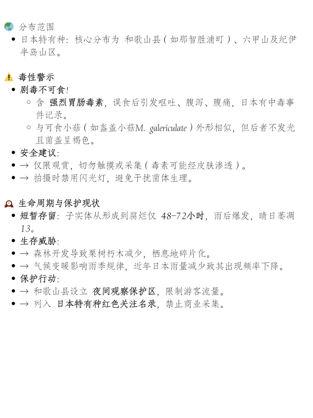 与可食小菇(如盔盖小菇M. galericulate)外形相似,但后者不发光且菌盖呈褐色。