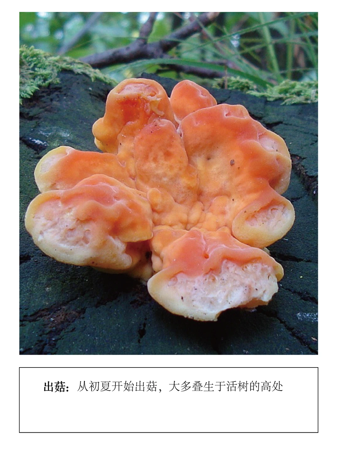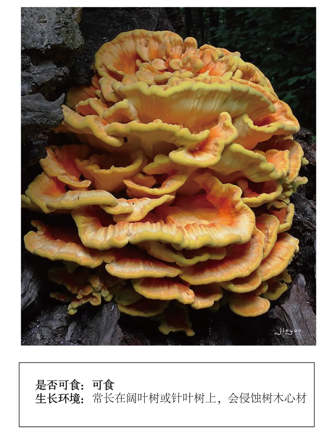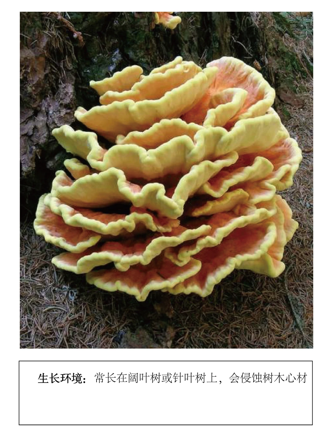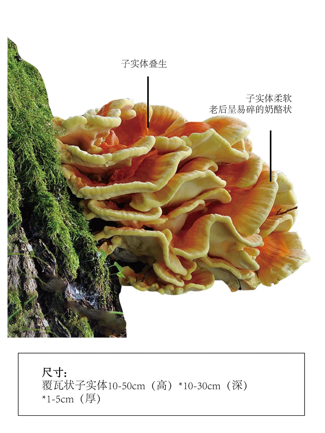 硫色㶷孔菌的菌盖肉质,扇形至半圆形,有放射状起伏丝,多数重叠生长。菌盖直径可达30-40cm,单个菌盖5-20cm,厚度在1-2cm之间。表面颜色鲜朱红色,或带黄的朱红色,菌肉鳟肉色。幼时肉质有弹性,干后变白且酥脆。🌈