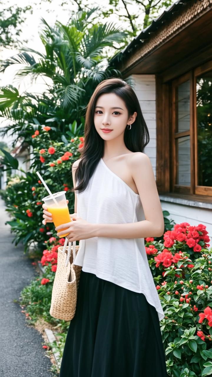 夏日清新穿搭,白色上衣搭配黑色长裙,手拿果汁,漫步在花丛中。