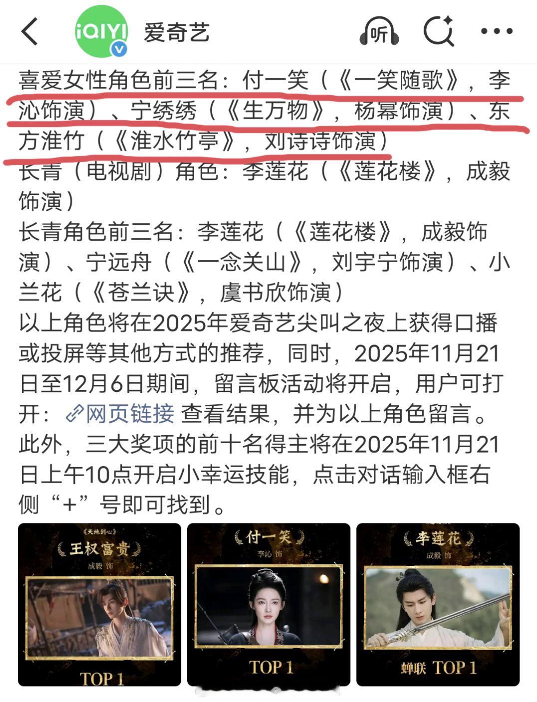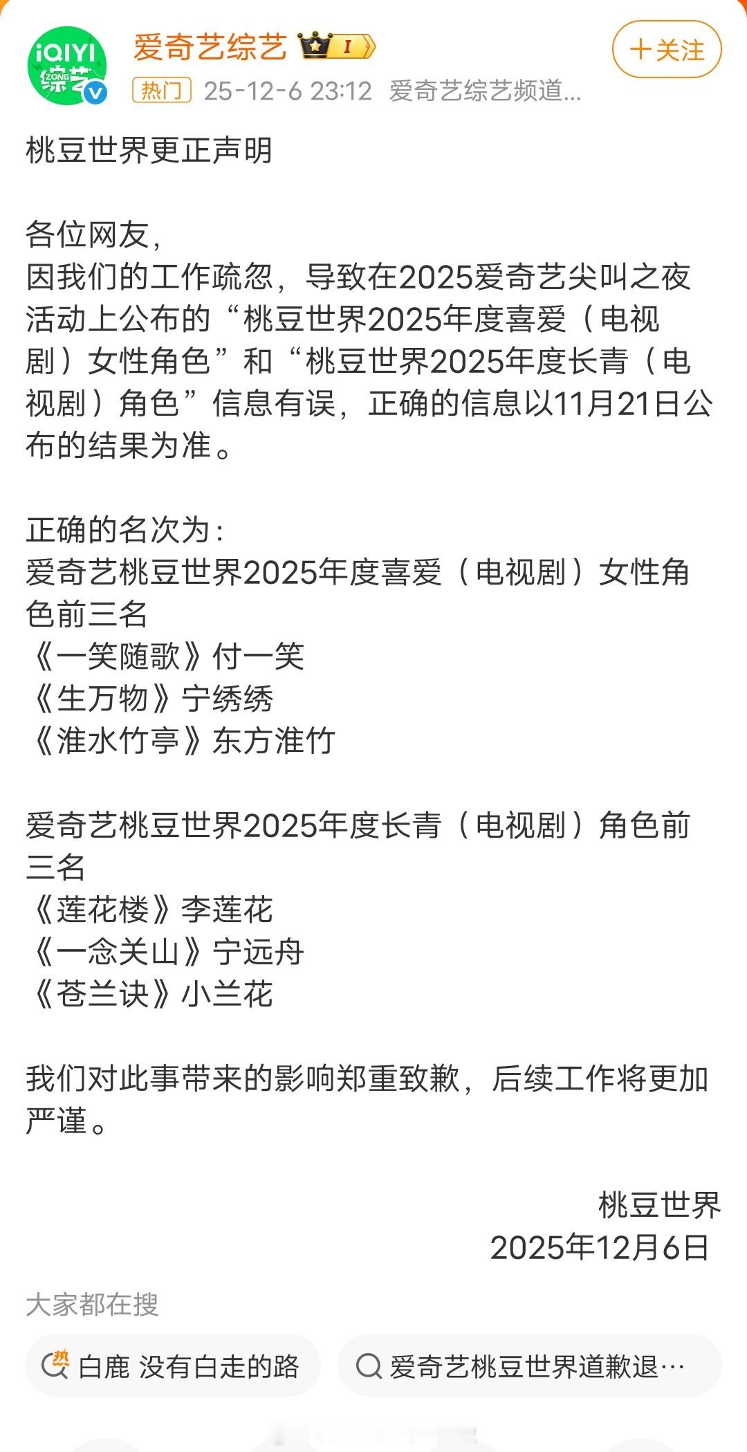 爱奇艺糖豆世界喜爱女性角色前三分别是:李沁付一笑、杨幂宁绣绣、刘诗诗东方淮竹。尖叫之夜在现场宣布这个奖时,白鹿的李青月蹿到第二,杨幂宁绣绣第三,刘诗诗的奖不翼而飞。。。粉丝真金白银投的票,送给刘诗诗和东方淮竹的奖项,最后就换来爱奇艺一句颁奖失误。。。爱奇艺颁奖失误 爱奇艺道歉 尖叫之夜