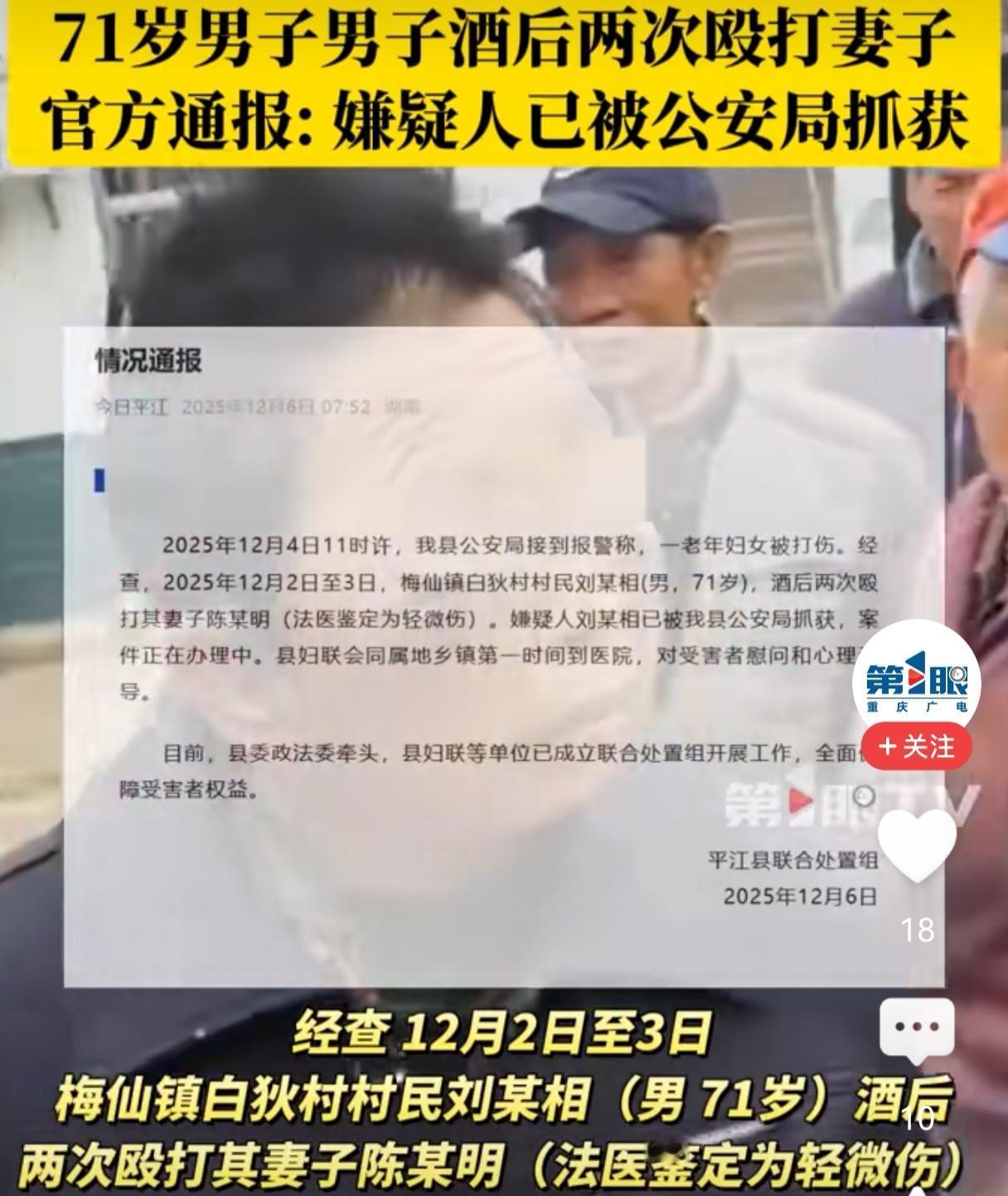 71岁男子, 酒后两次殴打妻子, 惊动了公安局已被抓获。 正应验了那句话:“婚姻千万别将就。”选择对了,被疼爱一辈子;选择错了,被欺负一辈子。 网友评论: 岁数这么大了,还这么嚣张,看来这是家暴一辈子了,该严惩 婚姻选对了天天情人节,选错了天天渡劫,对家暴零容忍,女人也要勇敢拿起法律武器,维护自己的合法权益 这则事件看得人满心愤慨!71岁男子酒后家暴妻子的行为,完全突破了道德与法律的底线,而“少年夫妻老来伴”的温情,在暴力面前荡然无存。更让人揪心的是受害者身心的双重伤害,所幸警方已介入、相关部门也成立了处置组,希望能切实保障受害者的权益,让施暴者得到应有的惩处。婚姻从不是忍气吞声的理由,面对家暴更不该将就,及时求助、用法律保护自己才是正解。 这个岁数就别再犹豫了,赶紧离婚,逃离这个没有人性的男人,不值得留恋 看来这老头子酒精中毒了 已经变态了 我这60岁的老头子,都恨得牙痒痒! 这都多大年纪了,被公安局因酒后打妻而抓,孩子们怎么看呀