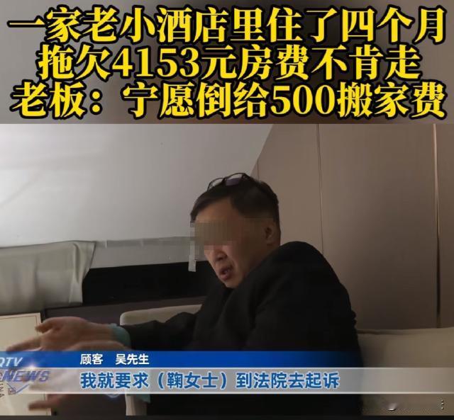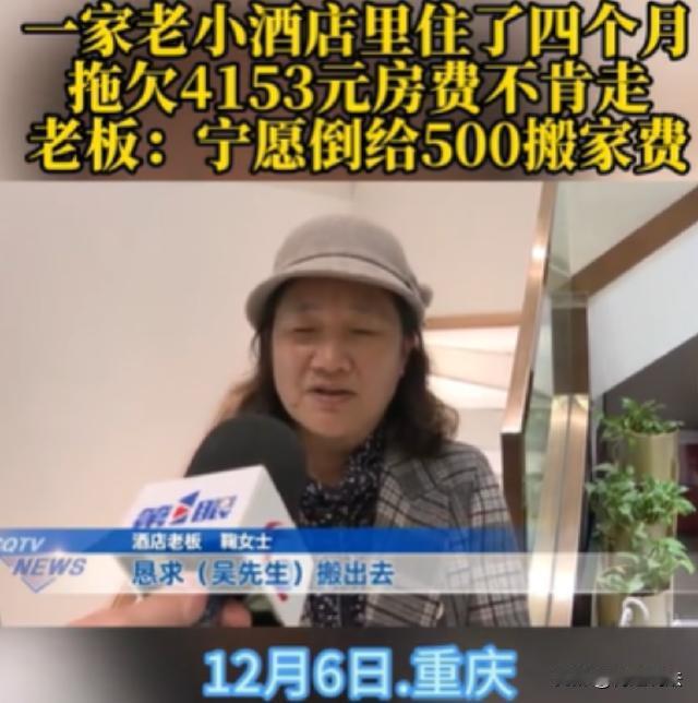 重庆,男子带着80岁的老母亲,和10多岁孩子住进一家每晚140元的酒店,住了4个月后,男子竟拖欠4153元房费不给,店老板多次讨要无果,对方还死皮赖脸不搬走,老板因对方上有老下有小,狠不下心硬赶,无奈断水断电,可对方仍不搬,最后老板表示不要房费,再给500元帮忙搬家,没想到对方不仅不感恩,还指着老板鼻子骂:你算哪把夜壶。 7月31日,吴先生带着80岁的母亲任婆婆和10岁儿子,住进鞠女士经营的酒店,约定每天房费140元。 起初2个多月,吴先生都按时交钱。 10月中旬,鞠女士发现吴先生交房费开始不及时了,起初她也没太在意,想着可能对方临时有困难。 可到了10月8号,吴先生直接就不交房费了,鞠女士心里有些着急,便找吴先生沟通。 鞠女士说:吴先生,你这房费都拖欠好几天啦,咱之前说好的按时交,你看能不能尽快补上? 吴先生却说:老板,我最近手头紧,再宽限几天呗。 鞠女士无奈地点点头:那行,你可得尽快。 可这一宽限,就没了下文,房费越欠越多,到后来竟欠了4153元。 鞠女士这下坐不住了,多次上门讨要房费。 鞠女士敲开吴先生的房门说:吴先生,这房费都欠这么多啦,你得赶紧给,我这小本生意,也经不起这么拖。 吴先生双手一摊:我没钱,你让我怎么给?有本事你把我赶出去。 鞠女士:你这人怎么能这样呢,咱都是有合同约定的。 吴先生却蛮不讲理:合同?合同能当饭吃,我就住这不走了。 鞠女士的朋友知道这事后,都建议她强行把吴先生一家赶出去。 可鞠女士看着屋里80岁的老人和10岁的孩子,实在狠不下心。 她想着再好好劝劝吴先生,说不定他能良心发现。 11月20号,鞠女士又找到吴先生,好言相劝:吴先生,你看你上有老下有小的,咱也得讲点诚信不是?这房费你多少得给点,我也不是为难你。 吴先生却把头一扭:我说了没钱就是没钱,你少在这啰嗦。 鞠女士无奈地说:那你总得给个说法,什么时候能给? 吴先生不耐烦地说:不知道,别烦我了。 11月27号,鞠女士实在没办法,只好出示了解除服务关系告知函,可吴先生一家依旧无动于衷,还是赖在屋里不走。 鞠女士对吴先生说:我都已经解除服务关系了,你们怎么还不走?这房间我都没法正常经营了。 吴先生却说:解除?解除有什么用,我就住这,你能把我怎么样? 鞠女士:你这是耍无赖。 吴先生却得意地说:我就耍无赖了,你能拿我咋办? 鞠女士实在没办法,只好断水断电,想着这样吴先生一家总会搬走了吧。 可没想到,对方还是不搬,依旧在屋里住着。 鞠女士对店员说:这可怎么办,我都断水断电了,他们还不走。 店员也愁眉苦脸:老板,要不还是报警吧。 鞠女士犹豫了一下:再等等吧,看看他们能不能自己搬走。 最后,鞠女士提出不要房费,还再给500元搬家费,希望吴先生一家能尽快搬走。 吴先生却指着鞠女士的鼻子骂:你算哪把夜壶,谁要你的臭钱,我就不走。说完,骂骂咧咧地离开了。 鞠女士真是够倒霉的,好心好意让吴先生一家住,结果却遇到这么个不讲诚信的人。 她看在老人和孩子的份上,一直忍让,可吴先生却得寸进尺,这种行为实在让人气愤。 吴先生既然住了酒店,就应该按照约定支付房费,拖欠房费还不搬走,这明显是不讲道理的行为。 吴先生拒不支付房费还不搬走,这种行为,已经涉嫌寻衅滋事。 根据《治安管理处罚法》第二十六条规定,有寻衅滋事行为的,处五日以上十日以下拘留,可以并处五百元以下罚款;情节较重的,处十日以上十五日以下拘留,可以并处一千元以下罚款。 鞠女士断水断电的行为,虽然是为了让吴先生一家搬走,但这种做法并不符合规定。 根据《民法典》的规定,物业服务人不得采取停止供电、供水、供热、供燃气等方式催交物业费。 鞠女士作为酒店经营者,虽然不是物业服务人,但这种断水断电的行为也会影响客人的基本生活,如果给客人造成损失,还可能要承担相应的赔偿责任。 根据《民法典》的规定,当事人一方不履行合同义务或者履行合同义务不符合约定的,应当承担继续履行、采取补救措施或者赔偿损失等违约责任。 鞠女士可以要求吴先生支付拖欠的房费,并赔偿因他的行为给酒店造成的损失。 鞠女士虽然出发点是好的,但维权方式不当。