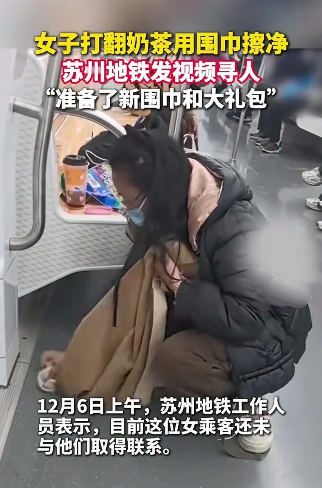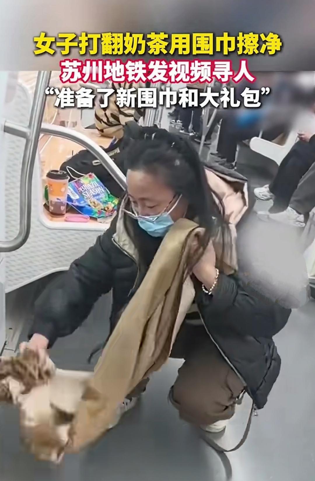 谁打翻奶茶会掏围巾擦?苏州地铁里这位女士不小心洒了奶茶,没慌着走,反而解下自己的围巾,蹲在地上把地面和座椅擦得干干净净,这细节戳中了无数人。 本是件悄悄做的小事,却被网友拍下来火了。苏州地铁直接发视频寻人,说要给她送新围巾和大礼包——这哪是送礼物,分明是给这份善意最温柔的回应。 现在总说“素质是小事”,可这位女士用围巾擦的不只是污渍,是公共场合的体面;地铁寻人的举动,是把普通人的善意接住、放大。 目前这位女士还没联系地铁,但这份双向的温暖已经传开了。生活里的光,从来都藏在这些不声不响的善良里。