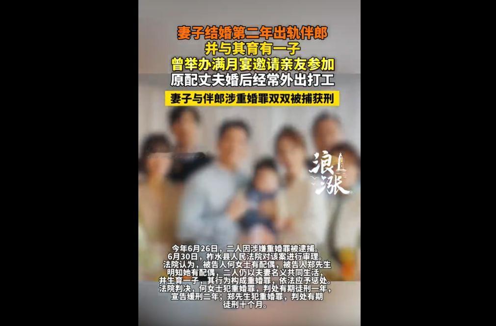 陕西柞水 28 岁的何女士,2019 年与程先生登记结婚,婚礼邀郑先生当伴郎。 因程先生常外出打工,婚后第二年,何女士便与郑先生以夫妻名义同居,2022 年生子时,郑先生还以配偶身份签医疗文件,2023 年二人更公开办满月宴。 今年 6 月二人因重婚罪被逮捕,12 月法院判何女士有期徒刑一年缓刑二年,郑先生十个月。 这对男女简直没脸没皮到极致! 何女士丈夫在外打工养家,她倒好,跟伴郎搞到一起还重婚生子,办满月宴时咋不想想自己是有夫之妇? 郑先生更缺德,明知人有家室,不仅插足还敢以配偶名义签文件,俩人为了私情,把道德和法律全踩在脚下,被判刑就是罪有应得,缓刑都算轻的! 最心疼程先生!在外辛苦挣钱,回家却发现妻子背叛还生了别人的娃,这得多大打击? 俩人事发后一点愧疚都没有,全程只顾自己快活,把原配的尊严按在地上摩擦,这种人就该被钉在道德耻辱柱上,让所有人都知道他们有多恶心! 法院这判决算给婚姻敲了重锤!别以为出轨重婚能蒙混过关,法律可不惯着! 这案子就是告诉所有人:婚姻不是儿戏,忠诚是底线,敢突破底线,既要被唾沫星子淹死,更要蹲大牢! 谁要是还敢学这对男女,先掂量掂量自己能不能扛住法律的制裁和道德的骂名!
