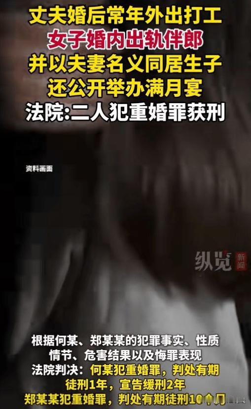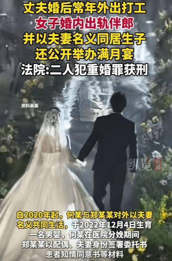 陕西柞水,一女子和丈夫结婚当天,伴郎对新娘暗生情愫。婚后一年新郎外出打工,伴郎趁机靠近新娘,两人发生不正当关系,还以夫妻名义生活,女子为伴郎产下一子。更离谱的是,二人公开为孩子办满月宴,亲朋好友都到场。但纸终究包不住火,最终二人因犯重婚罪被判刑。 2019年12月19日,22岁的何某和程某领证结婚,按习俗办了婚礼,程某邀好友郑某某当伴郎。 单身的郑某某见何某漂亮,心生爱慕,虽拼命压抑,但情愫悄然埋下。 程某和何某婚后,程某为了多赚些钱,婚后一年多便外出打工,留下何某独自在家。 何某每天守着空荡荡的房子,心里头空落落的,连个说话的人都没有。 郑某某一直对何某念念不忘,他瞅准程某不在家的机会,三天两头往何某家跑。 一开始,何某还觉得不好意思,可架不住郑某某的软磨硬泡。 这天,郑某某又提着水果来到何某家,一进门就满脸堆笑地说,我听说你最近身体不太舒服,特意买了点水果来看看你。 何某有些慌乱地说,其实也没什么事,就是一个人在家有点闷。 郑某某顺势坐在何某旁边说,我知道你一个人在家不容易,以后有什么事尽管跟我说,我肯定帮你。 何某心里有点感动,可还是有些犹豫,毕竟自己是有夫之妇。 但郑某某的攻势越来越猛,他每天变着花样给何某送吃的,陪她聊天解闷。 时间一长,何某心里的防线渐渐崩塌了。 2020年,两人突破底线发生了关系,之后更是公开以夫妻名义生活。 村里人一开始都觉得奇怪,可看他们俩出双入对的,也渐渐接受了。 2022年12月4日,何某为郑某某生下儿子。 郑某某在医院里,以配偶身份在各种文件上签字,那模样,仿佛他才是何某真正的丈夫。 2023年2月15日,两人还大张旗鼓地为儿子办了满月宴。 亲朋好友都到场祝贺,大家看着这热闹的场面,谁也没觉得有啥不对劲。 可纸终究包不住火,2023年3月29日,郑某某因为非法狩猎罪被抓进了监狱。 自此,他和何某的事情再也瞒不住了。 程某得知此事后,冲到何某面前,大声质问,你为什么要这么做,我对你不好吗? 何某低着头,不敢看程某的眼睛,小声说,我一个人在家太孤单了,他对我好。 程某说,孤单就能成为你背叛我的理由吗?你还有没有一点道德底线? 何某无言以对,只是默默地流泪。 何某和程某原本有着合法的婚姻关系,应该相互忠诚、相互扶持。 可何某却因为一时的孤单寂寞,背叛了程某的感情,这是对婚姻的不尊重,也是对感情的亵渎。 她没有珍惜和程某的感情,也没有考虑到自己的行为,会给程某带来多大的伤害。 婚姻不仅仅是两个人的结合,更是一种责任和承诺。 何某在结婚时就已经承诺要忠于程某,可她却违背了自己的承诺。 郑某某明明知道何某已经结婚,还去介入别人的婚姻,这也是不道德的行为。 他们两人的行为都违背了公序良俗,破坏了家庭的和谐稳定。 何某有合法婚姻却和郑某某以夫妻名义生活生子,郑某某明知何某已婚仍介入,两人公开同居、办满月宴获亲属认可,这些行为符合重婚罪的认定。 根据刑法第二百五十八条规定,有配偶而重婚的,或者明知他人有配偶而与之结婚的,处二年以下有期徒刑或者拘役。 最终,法院认定何某犯重婚罪,判有期徒刑1年,缓刑2年;郑某某犯重婚罪,判有期徒刑10个月。