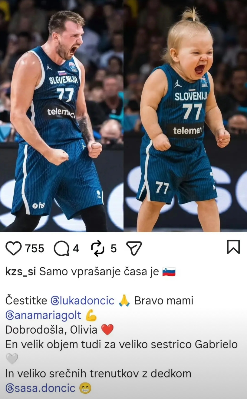 有意思的是,在东契奇二女儿出生后,斯洛文尼亚男篮在社交媒体上晒出照片表达祝贺,里面是东契奇身穿77号国家队球衣振臂怒吼庆祝的画面,旁边则PS了一张东契奇女儿模仿父亲的照片,画面十分有趣、温馨。作为斯洛文尼亚男篮的领军人物,东契奇的待遇真非同一般!