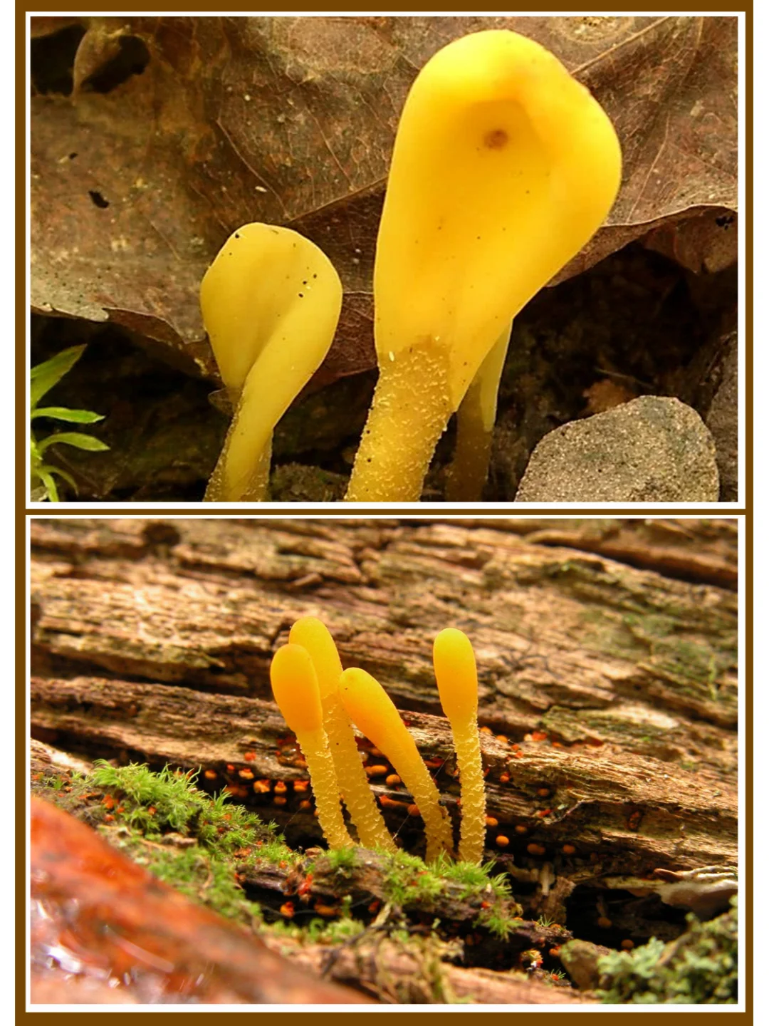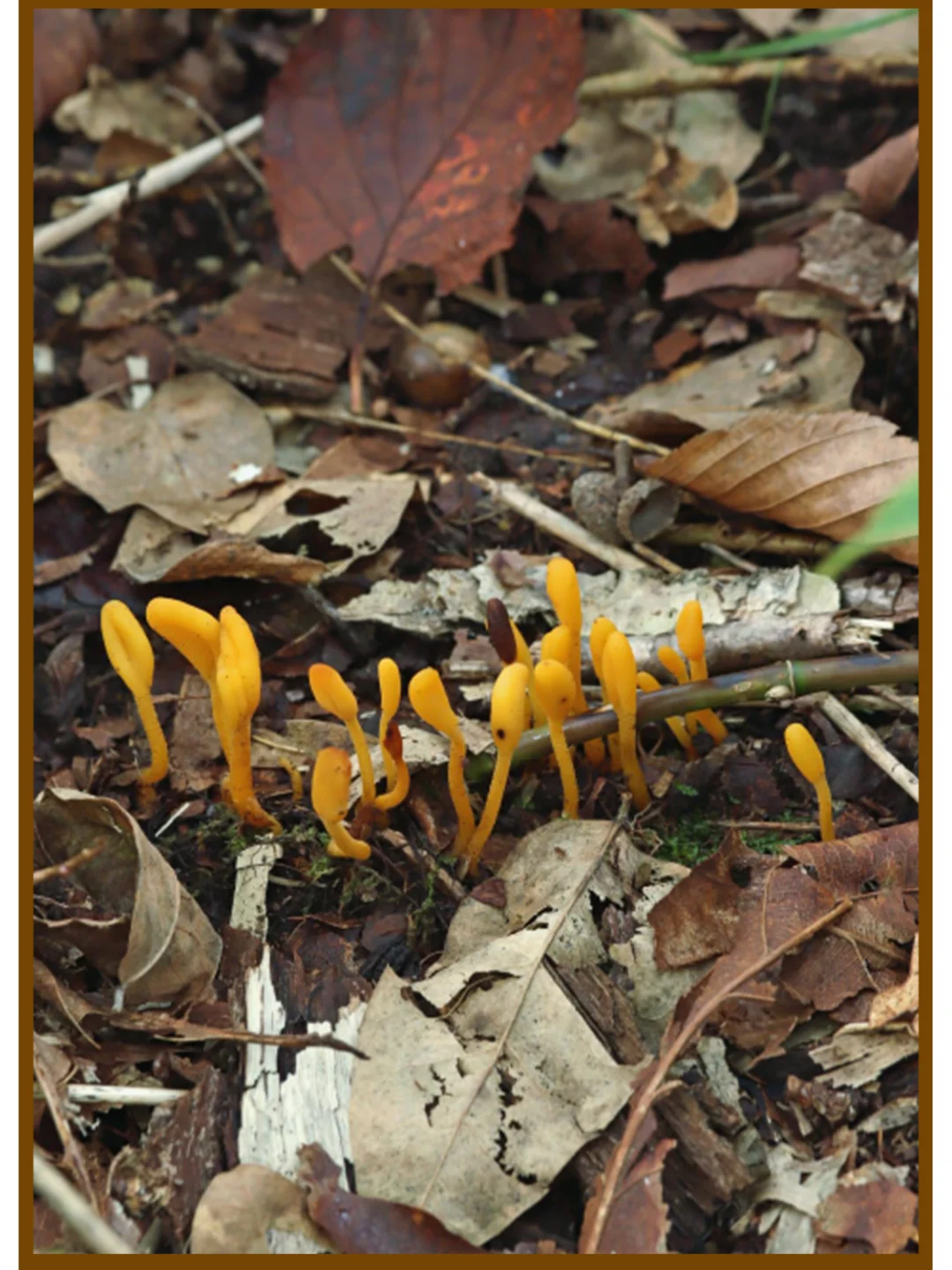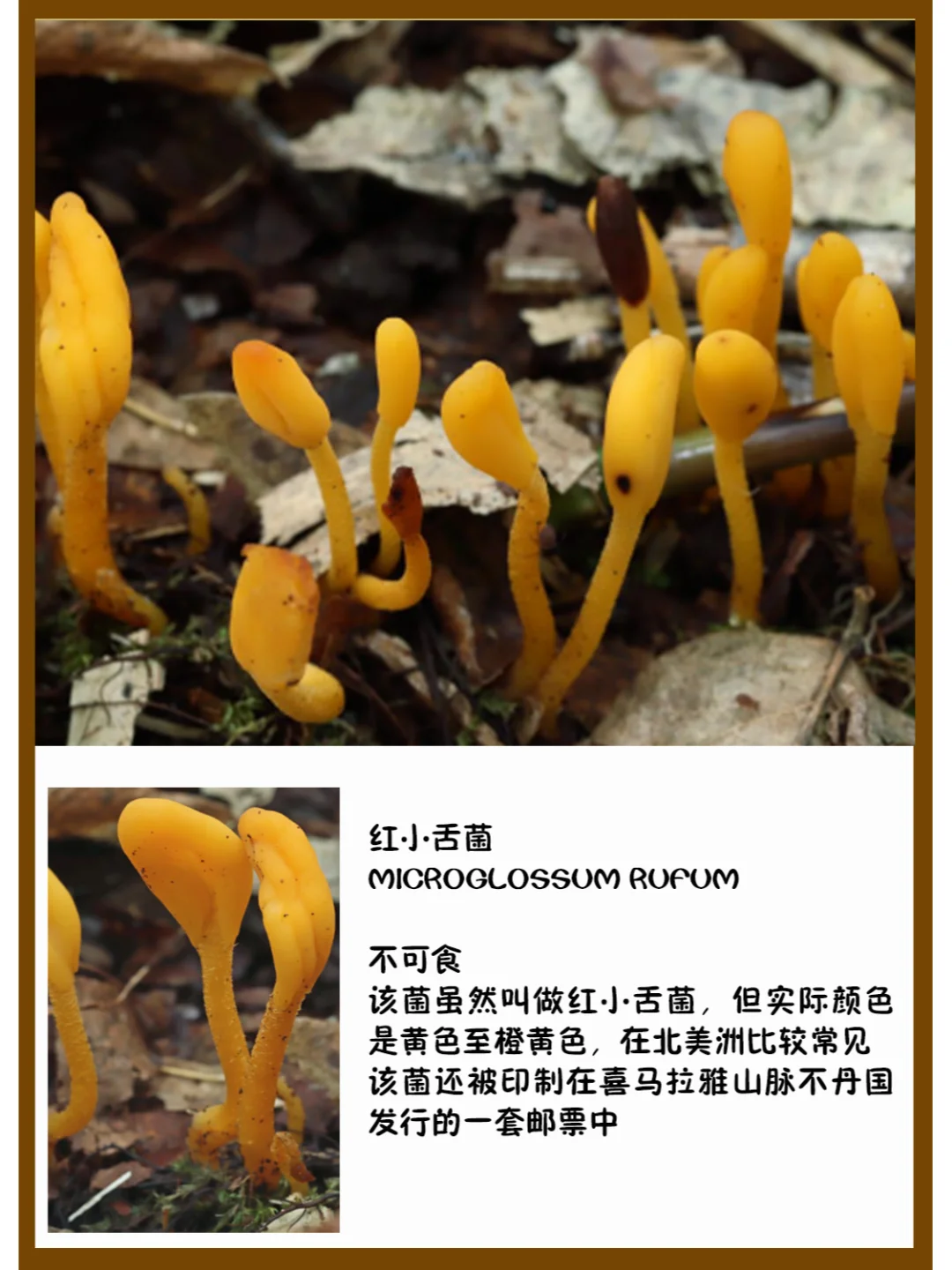 红小舌菌 Microglossum rufum 不可食 该菌虽然叫做红小舌菌,但实际颜色是黄色至橙黄色,在北美洲比较常见 该菌还被印制在喜马拉雅山脉不丹国发行的一套邮票中