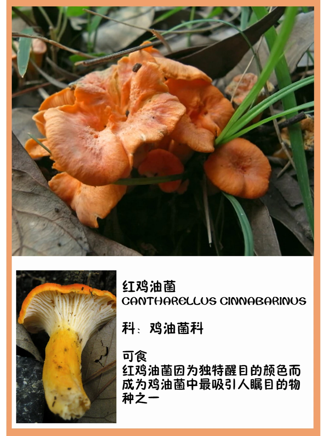 红鸡油菌 Cantharellus cinnabarinus 科:鸡油菌科 图片©manatarka.org ©josef hlasek ©oso 可食 红鸡油菌因为独特醒目的颜色而成为鸡油菌中最吸引人瞩目的物种之一[害羞R] 红鸡油菌子实体很小,所以尽管可以食用,它并没有像鸡油菌那样被大规模采摘并形成商业化出售