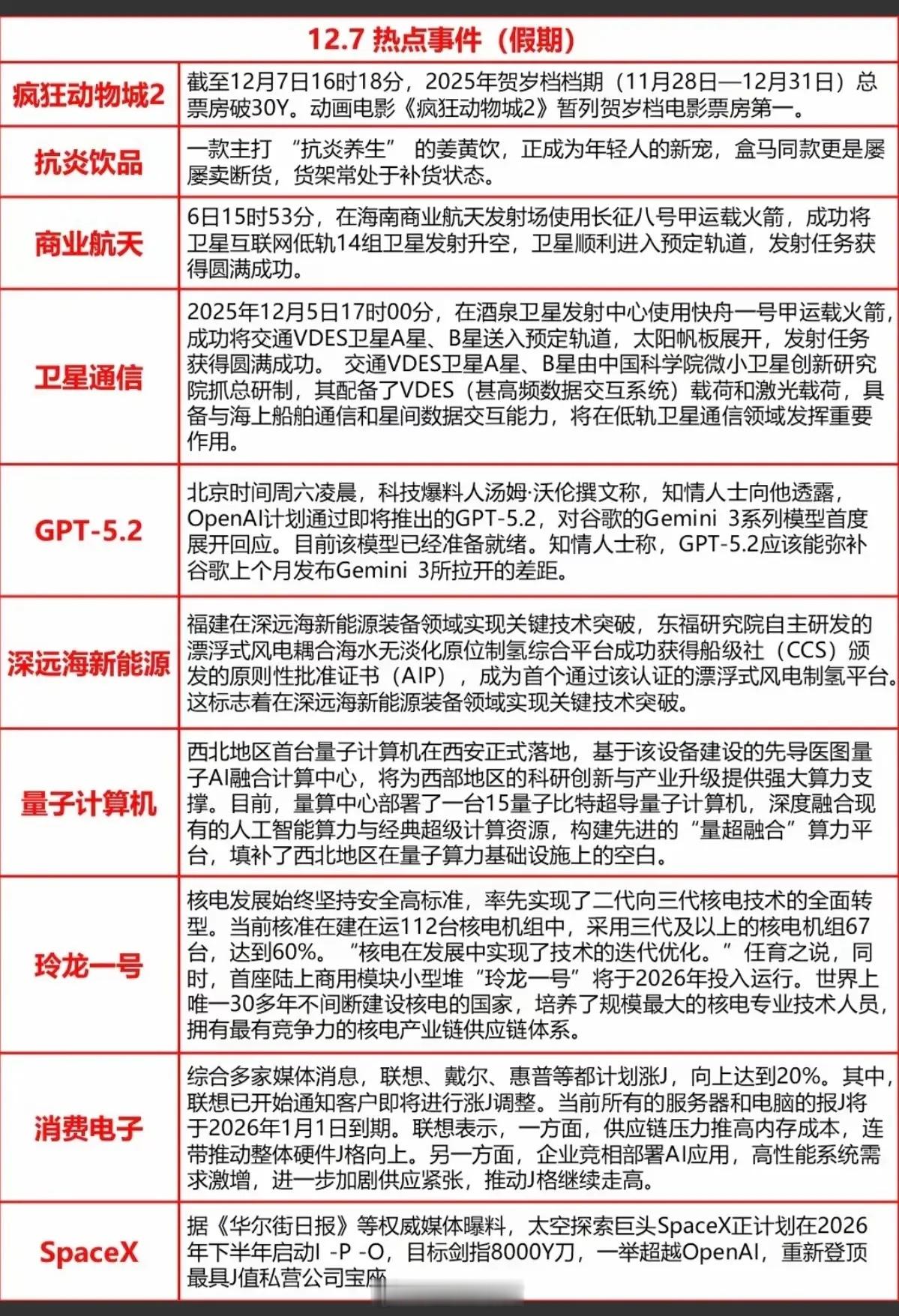 12.7周末晚间 重要财经信息汇总!1.深远海新能源2.ChatGPT-5.23.商业航天,卫星通信4.玲珑一号5.量子计算机6.消费电子7.SpaceX